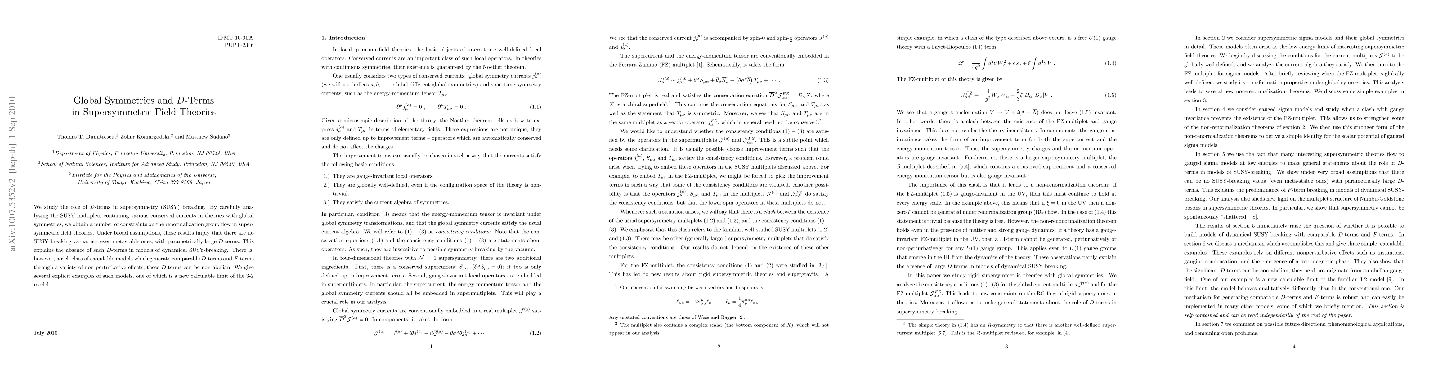 We study the role of D-terms in supersymmetry (SUSY) breaking. By carefully analyzing the SUSY multiplets containing various conserved currents in theories with global symmetries, we obtain a number of constraints on the renormalization group flow in supersymmetric field theories. Under broad assumptions, these results imply that there are no SUSY-breaking vacua, not even metastable ones, with parametrically large D-terms. This explains the absence of such D-terms in models of dynamical SUSY-breaking. There is, however, a rich class of calculable models which generate comparable D-terms and F-terms through a variety of non-perturbative effects; these D-terms can be non-abelian. We give several explicit examples of such models, one of which is a new calculable limit of the 3-2 model.