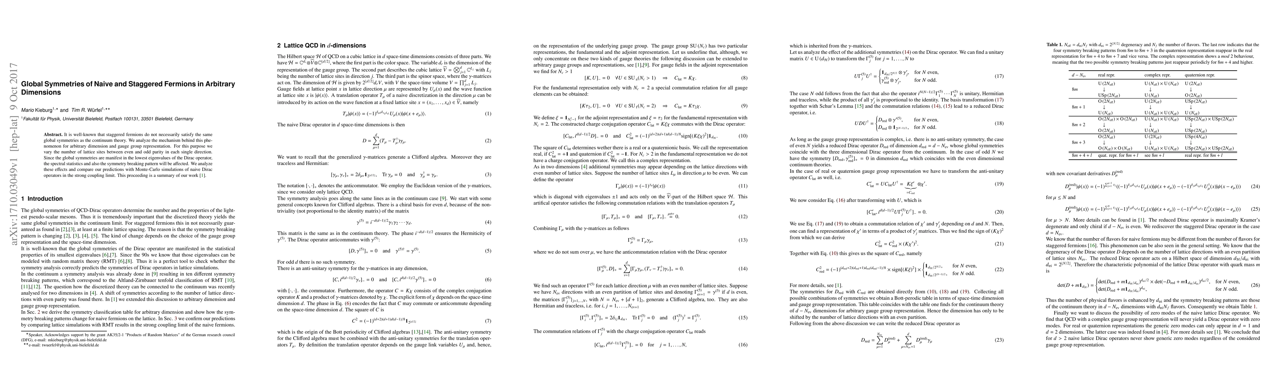 This paper investigates how staggered fermions differ from naive fermions in their global symmetries across various dimensions and gauge representations. It explores the impact of varying lattice site parity on the Dirac operator's lowest eigenvalues, analyzing the resulting symmetry breaking patterns and comparing theoretical predictions with Monte-Carlo simulations.