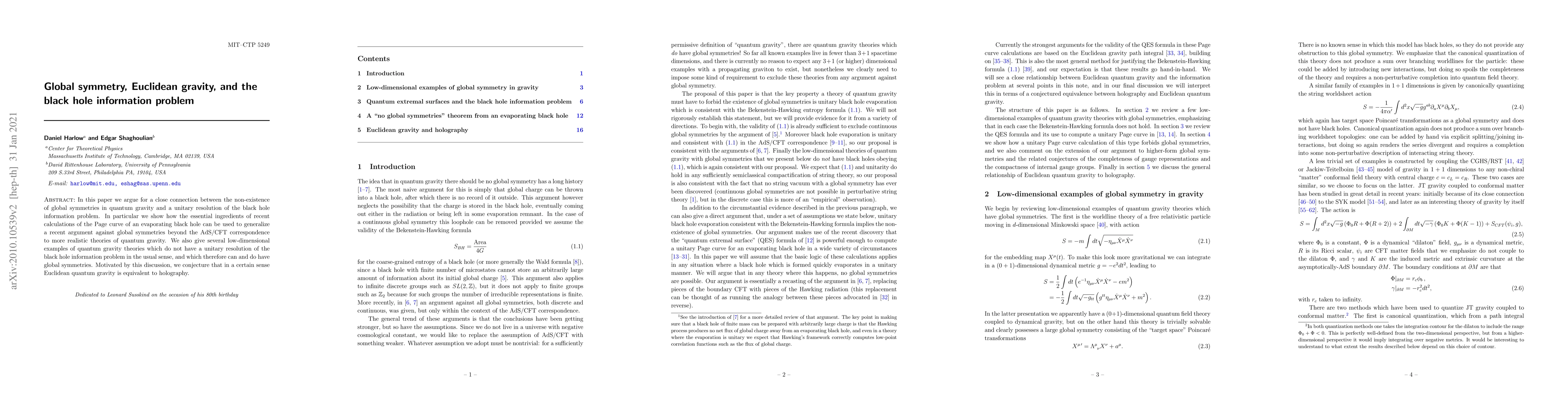 This paper explores the connection between the absence of global symmetries in quantum gravity and the resolution of the black hole information paradox, suggesting that Euclidean quantum gravity may be equivalent to holography. It uses the Page curve of evaporating black holes to argue against global symmetries in realistic quantum gravity theories.