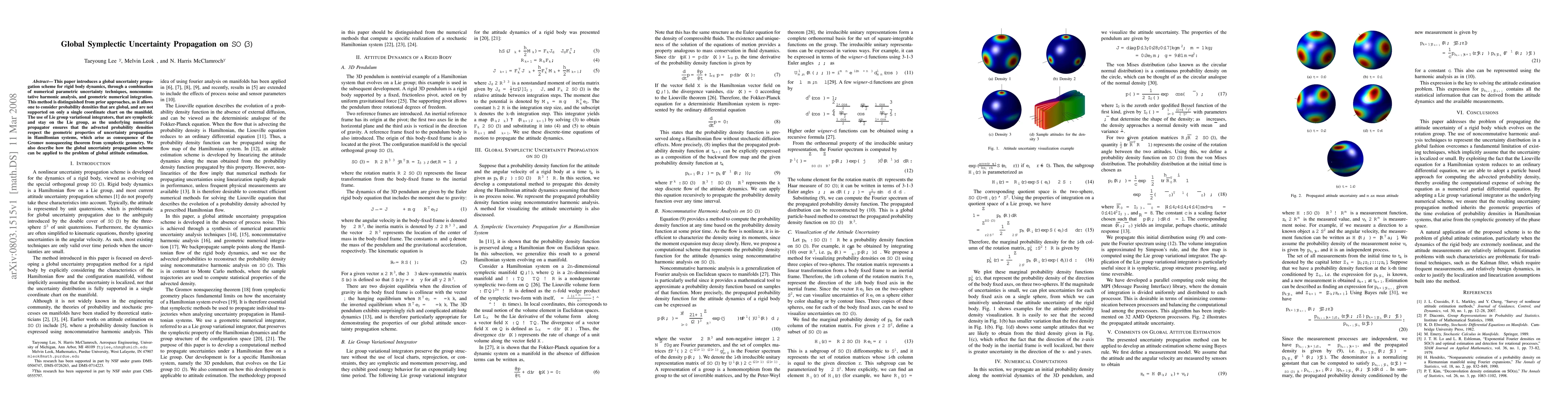 This paper presents a novel global uncertainty propagation method for rigid body dynamics, combining numerical techniques, noncommutative harmonic analysis, and symplectic geometric integration on SO(3). The method respects the geometric properties of Hamiltonian systems and can be applied to global attitude estimation.