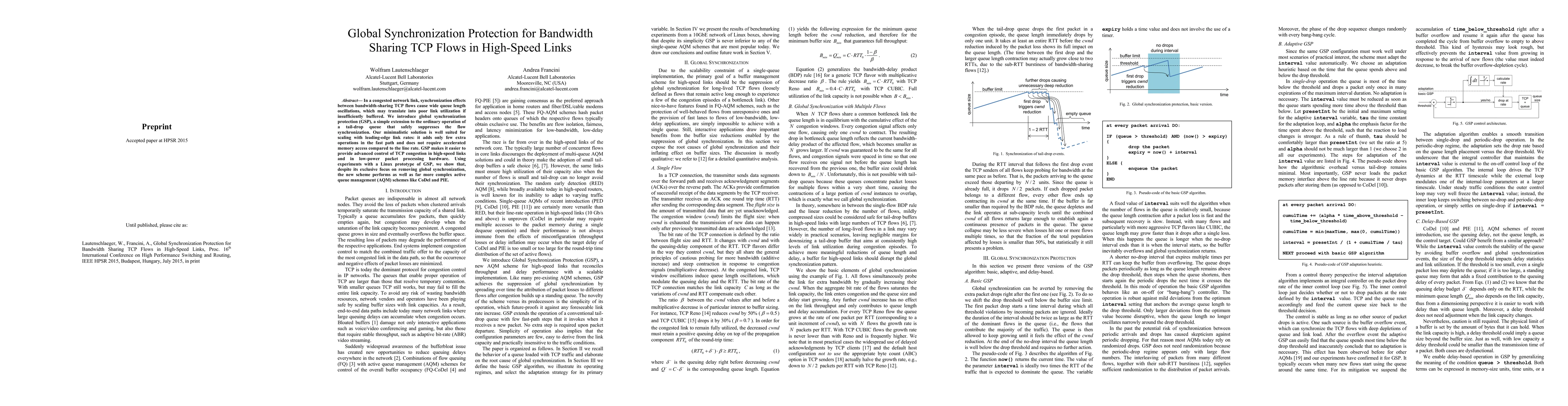 This paper introduces global synchronization protection (GSP), a method to mitigate synchronization effects between TCP flows in high-speed networks, thereby reducing queue length oscillations and improving link utilization. GSP adds minimal overhead and performs competitively against complex active queue management schemes.