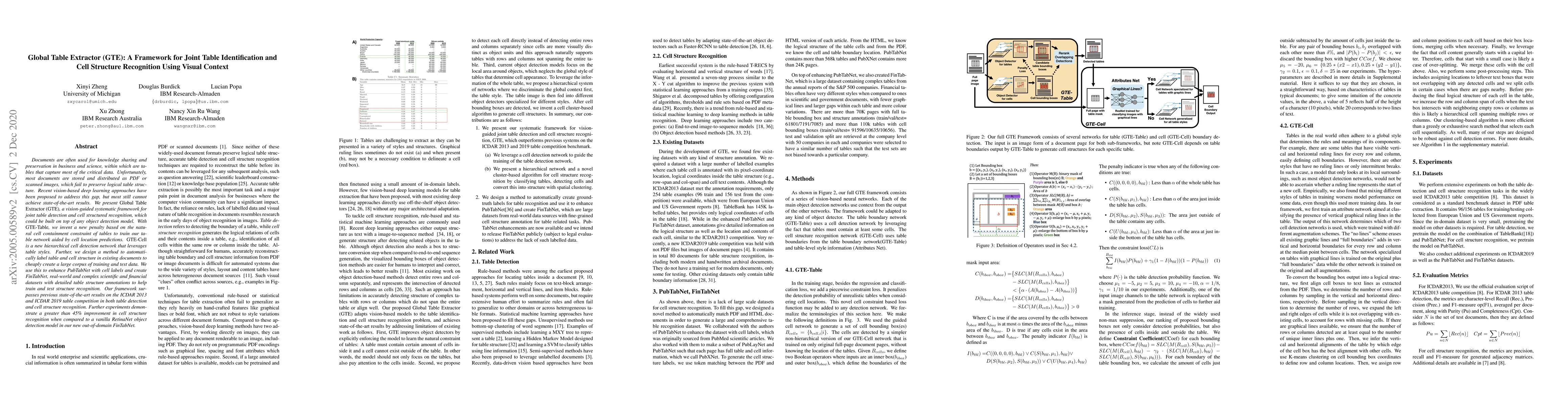 The Global Table Extractor (GTE) framework presents a vision-guided approach for joint table detection and cell structure recognition, achieving state-of-the-art results on ICDAR 2013 and 2019 competitions. It introduces GTE-Table and GTE-Cell networks, and a method for automatic labeling to enhance training data, leading to significant improvements in table extraction and cell structure recognition.