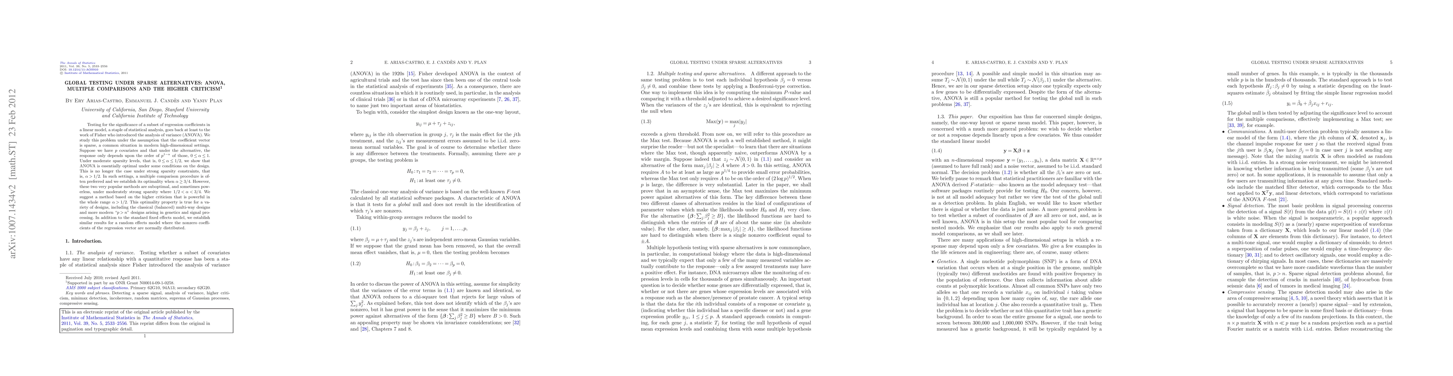This paper investigates statistical testing for sparse alternatives in linear models, comparing ANOVA, multiple comparisons, and the higher criticism method. It finds ANOVA optimal under moderate sparsity but suboptimal under strong sparsity, while the higher criticism method is shown to be powerful across a broader range of sparsity levels.