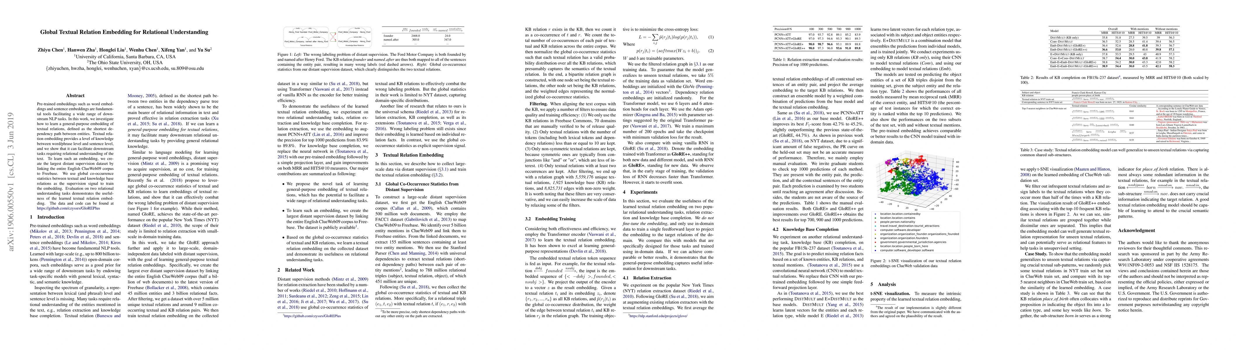 This paper proposes a method for learning general-purpose textual relation embeddings that capture the shortest dependency paths between entities, situated between word/phrase and sentence levels. The authors create a large distant supervision dataset by linking the ClueWeb09 corpus to Freebase and use global co-occurrence statistics to train the embedding, demonstrating its effectiveness in relational understanding through evaluations on two tasks.