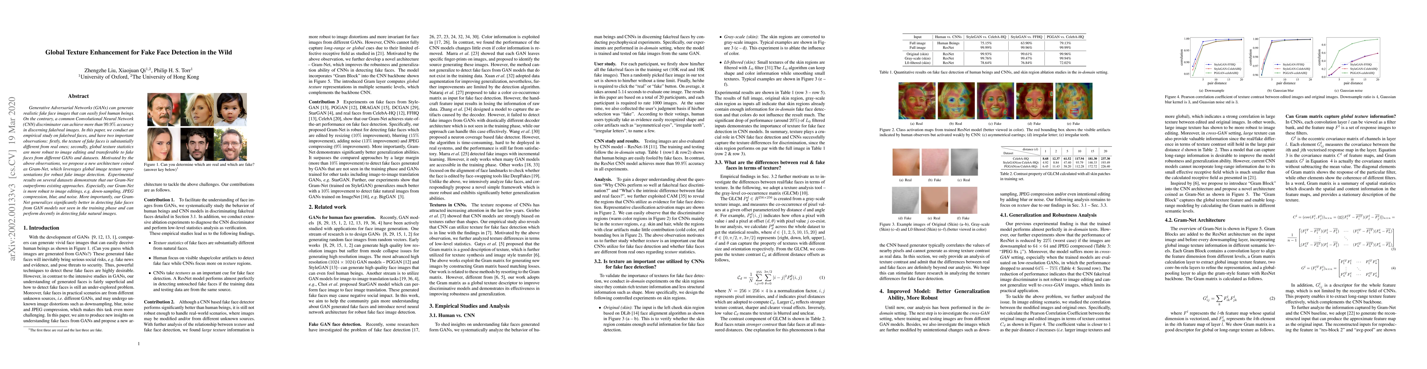 This paper proposes Gram-Net, a new architecture leveraging global texture statistics for detecting fake faces generated by GANs. The authors find that fake faces have distinct textures compared to real ones, and their method outperforms existing approaches, especially in handling image edits and generalizing to unseen GAN models.