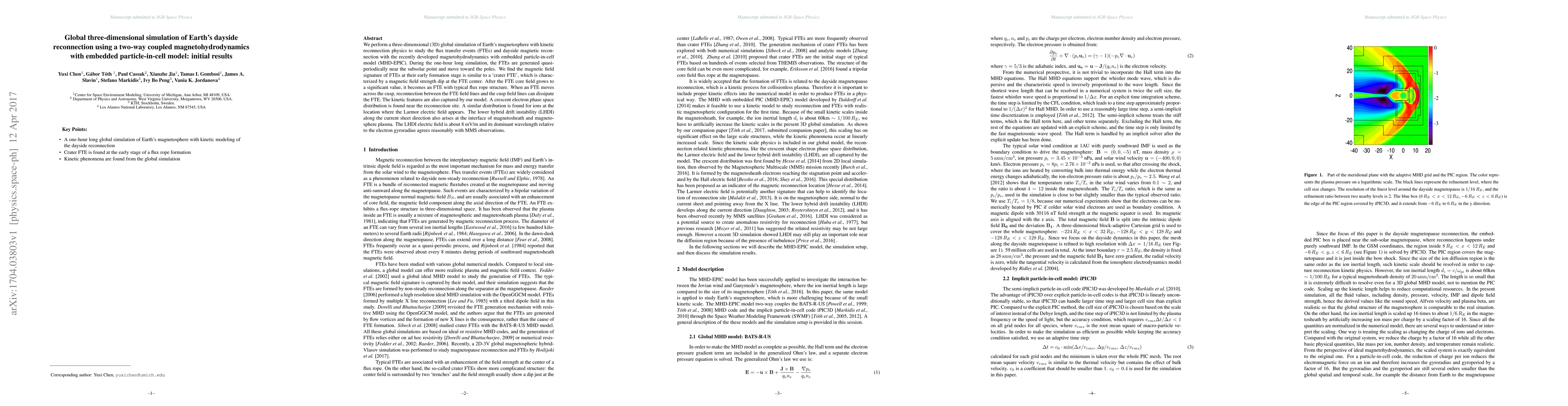 This paper presents a global three-dimensional simulation of Earth's dayside reconnection using a coupled MHD-EPIC model, revealing quasi-periodic flux transfer events (FTEs) and their evolution into typical flux ropes. Kinetic features such as crescent electron distributions and lower hybrid drift instability are observed, with electric field strengths matching MMS observations.
