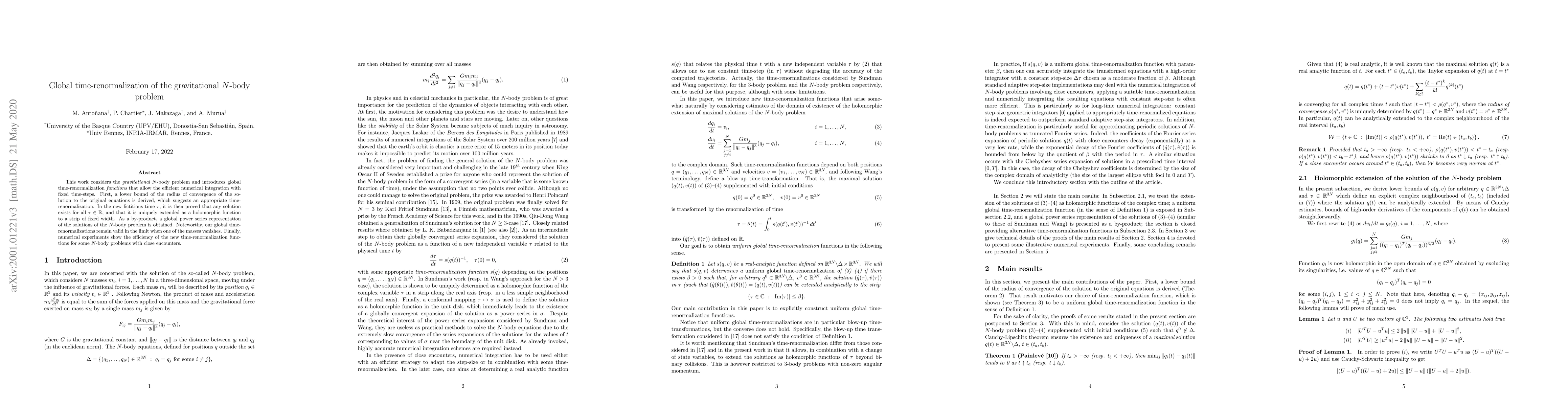 This work considers the {\em gravitational} $N$-body problem and introduces global time-renormalization {\em functions} that allow the efficient numerical integration with fixed time-steps. First, a lower bound of the radius of convergence of the solution to the original equations is derived, which suggests an appropriate time-renormalization. In the new fictitious time $\tau$, it is then proved that any solution exists for all $\tau \in \mathbb{R}$, and that it is uniquely extended as a holomorphic function to a strip of fixed width. As a by-product, a global power series representation of the solutions of the $N$-body problem is obtained. Noteworthy, our global time-renormalizations remain valid in the limit when one of the masses vanishes. Finally, numerical experiments show the efficiency of the new time-renormalization functions for some $N$-body problems with close encounters.