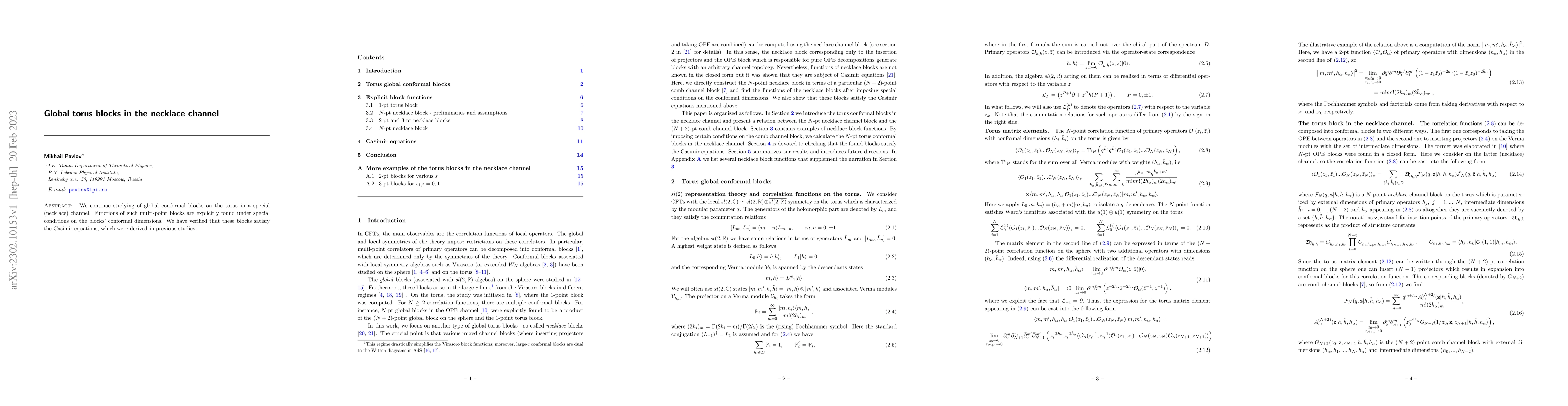 This paper identifies and explicitly calculates global conformal blocks on a torus in the necklace channel under specific conformal dimension conditions, confirming their compliance with previously derived Casimir equations.