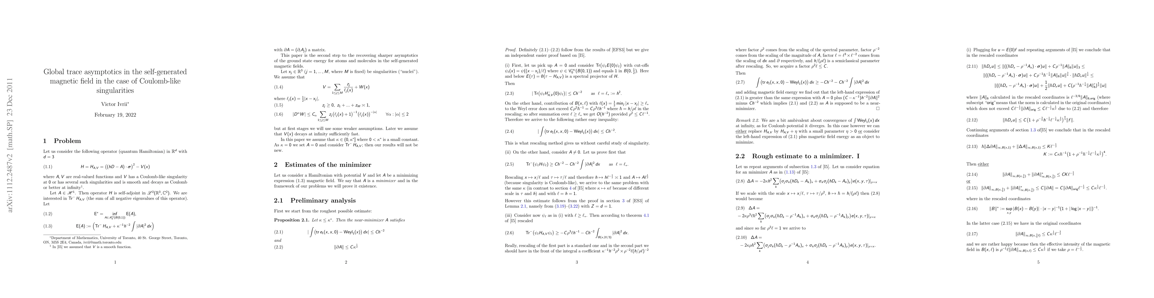 We consider a semiclassical asymptotics of local trace for the 3D-Schroedinger operator with self-generated magnetic field in the case when electric potential has one or several Coulomb-like singularities; it is given by Weyl expression plus (magnetic) Scott correction term with O(h^{-4/3}) error provided distance between singularities is large enough. Significant improvement and simplification in comparison to v1.