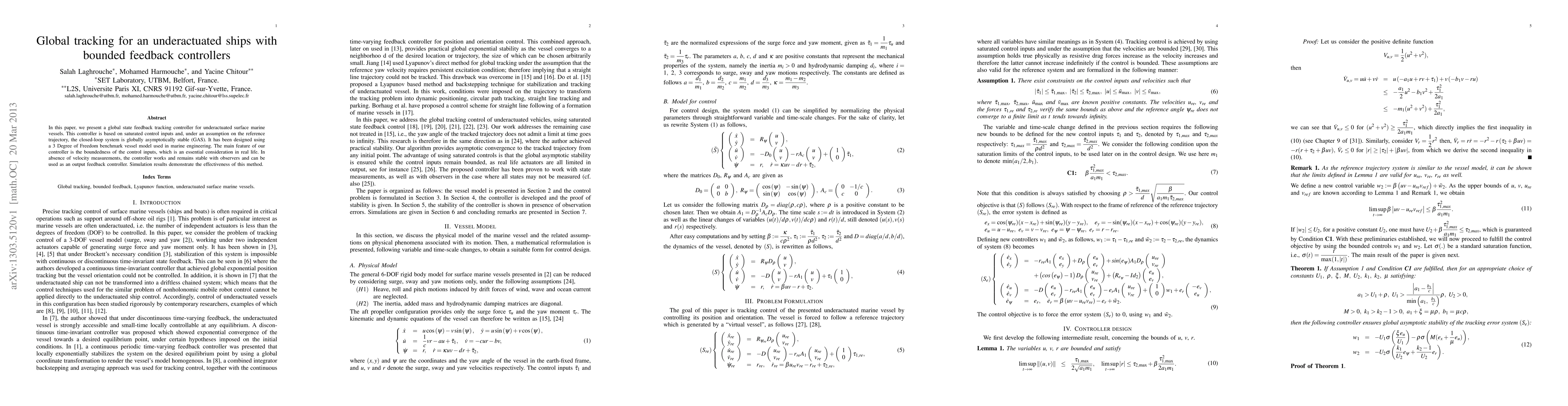 In this paper, we present a global state feedback tracking controller for underactuated surface marine vessels. This controller is based on saturated control inputs and, under an assumption on the reference trajectory, the closed-loop system is globally asymptotically stable (GAS). It has been designed using a 3 Degree of Freedom benchmark vessel model used in marine engineering. The main feature of our controller is the boundedness of the control inputs, which is an essential consideration in real life. In absence of velocity measurements, the controller works and remains stable with observers and can be used as an output feedback controller. Simulation results demonstrate the effectiveness of this method.
