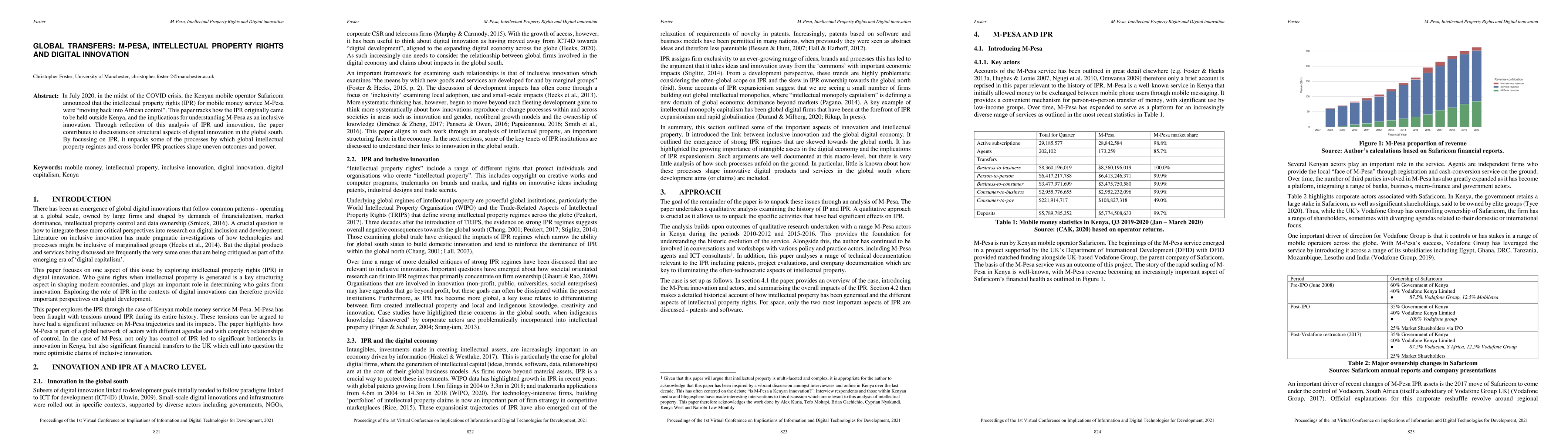 This paper examines the history of intellectual property rights (IPR) for M-Pesa, a Kenyan mobile money service, and its shift back to African control, highlighting the implications for inclusive innovation. It explores how global IPR regimes influence digital innovation in the global south, revealing the power dynamics and uneven outcomes shaped by cross-border IPR practices.