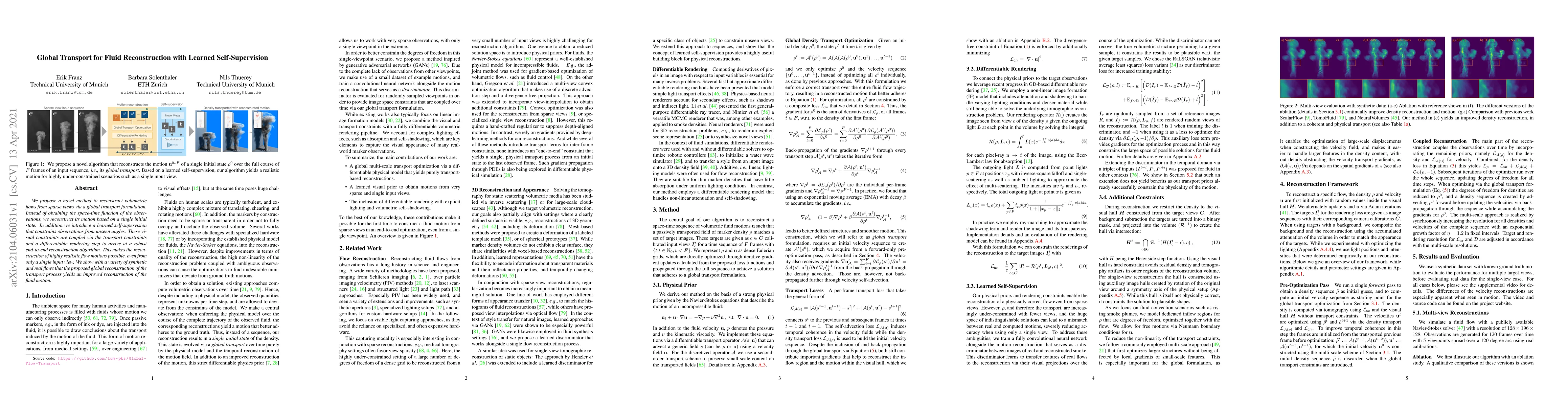 We propose a novel method to reconstruct volumetric flows from sparse views via a global transport formulation. Instead of obtaining the space-time function of the observations, we reconstruct its motion based on a single initial state. In addition we introduce a learned self-supervision that constrains observations from unseen angles. These visual constraints are coupled via the transport constraints and a differentiable rendering step to arrive at a robust end-to-end reconstruction algorithm. This makes the reconstruction of highly realistic flow motions possible, even from only a single input view. We show with a variety of synthetic and real flows that the proposed global reconstruction of the transport process yields an improved reconstruction of the fluid motion.