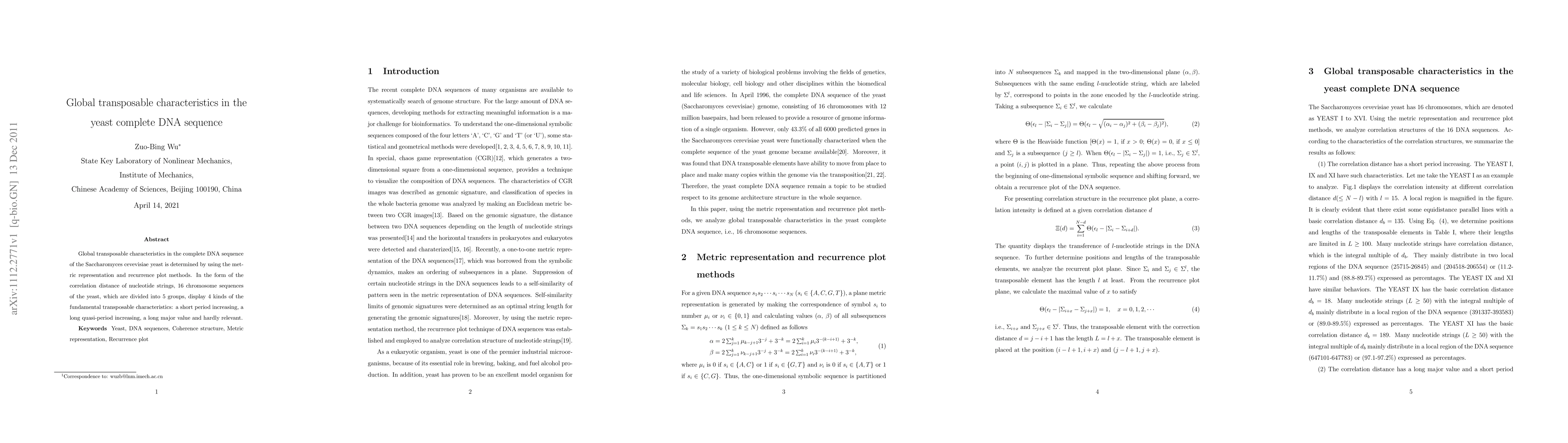 Global transposable characteristics in the complete DNA sequence of the Saccharomyces cevevisiae yeast is determined by using the metric representation and recurrence plot methods. In the form of the correlation distance of nucleotide strings, 16 chromosome sequences of the yeast, which are divided into 5 groups, display 4 kinds of the fundamental transposable characteristics: a short period increasing, a long quasi-period increasing, a long major value and hardly relevant.