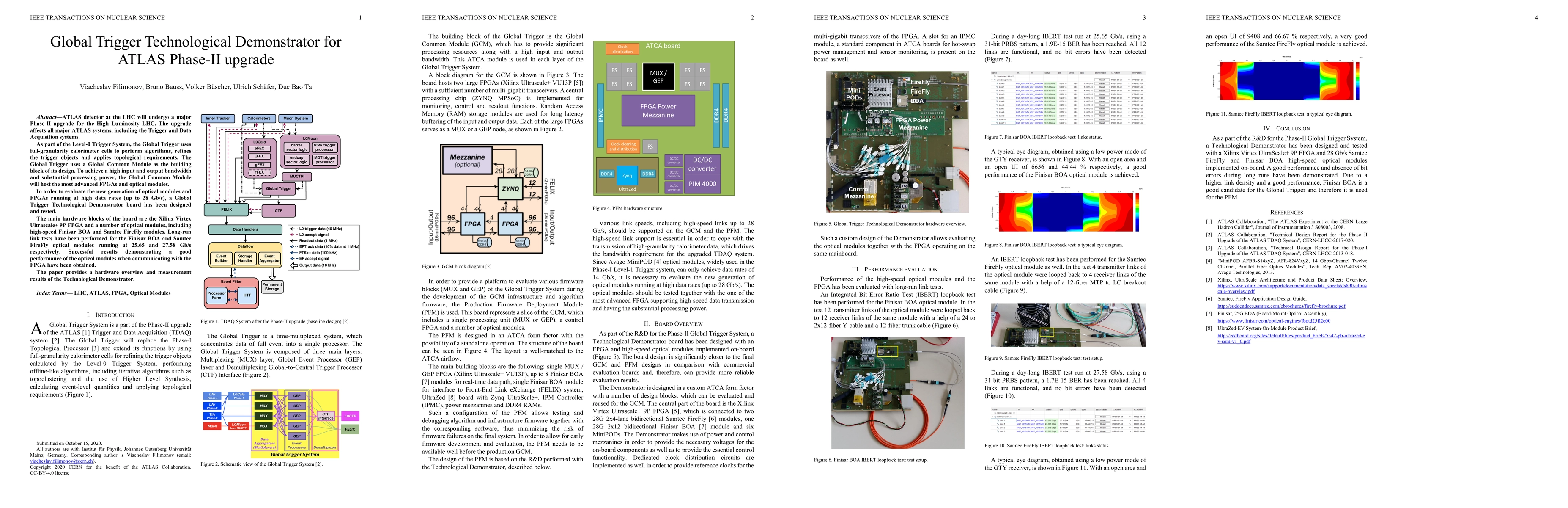 The ATLAS Phase-II upgrade includes a Global Trigger Technological Demonstrator utilizing advanced FPGAs and optical modules to evaluate high-speed data rates. Tests on Finisar BOA and Samtec FireFly modules demonstrated successful communication at 25.65 and 27.58 Gb/s, respectively, showcasing the potential for the upgrade.