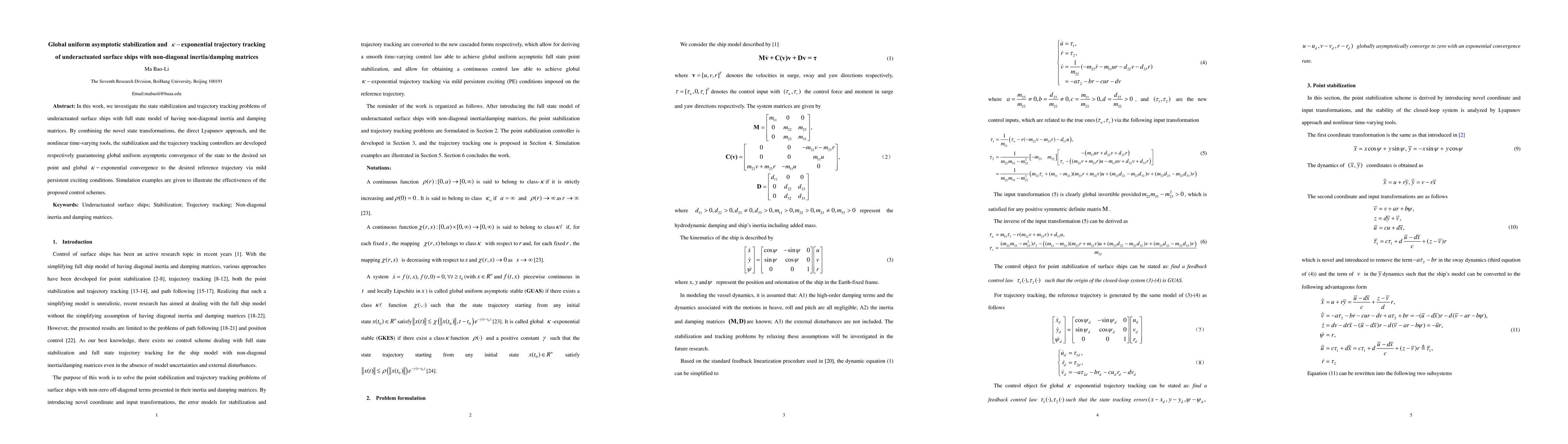 This paper develops stabilization and trajectory tracking controllers for underactuated surface ships with non-diagonal inertia and damping matrices, ensuring global uniform asymptotic convergence and k-exponential convergence using state transformations and Lyapunov methods. Simulation results validate the effectiveness of the proposed control schemes.