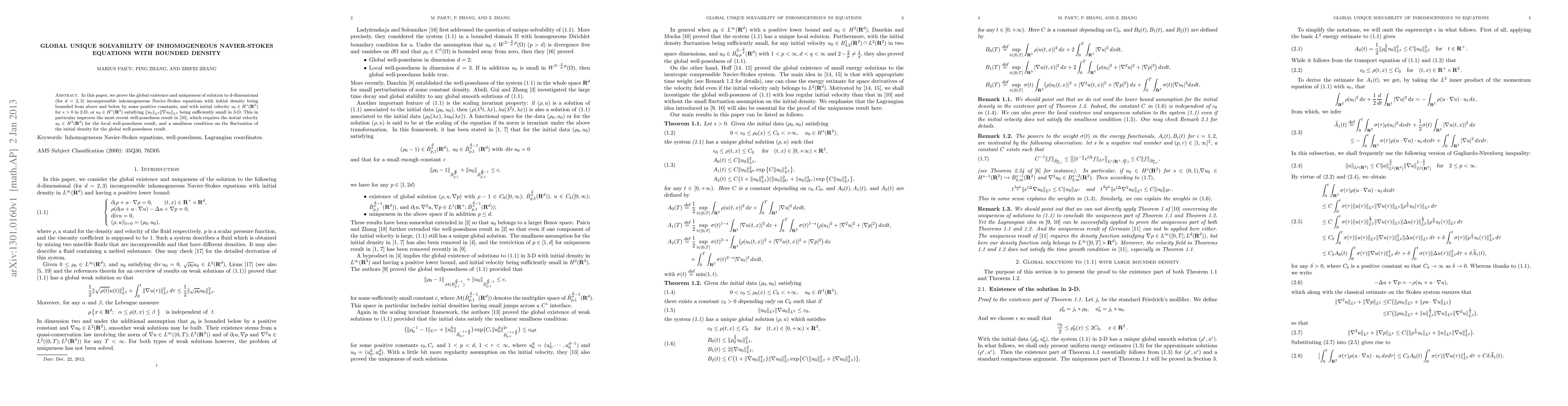 This paper proves the global existence and uniqueness of solutions to inhomogeneous Navier-Stokes equations with bounded density and initial velocity under relaxed conditions, improving upon existing well-posedness results.