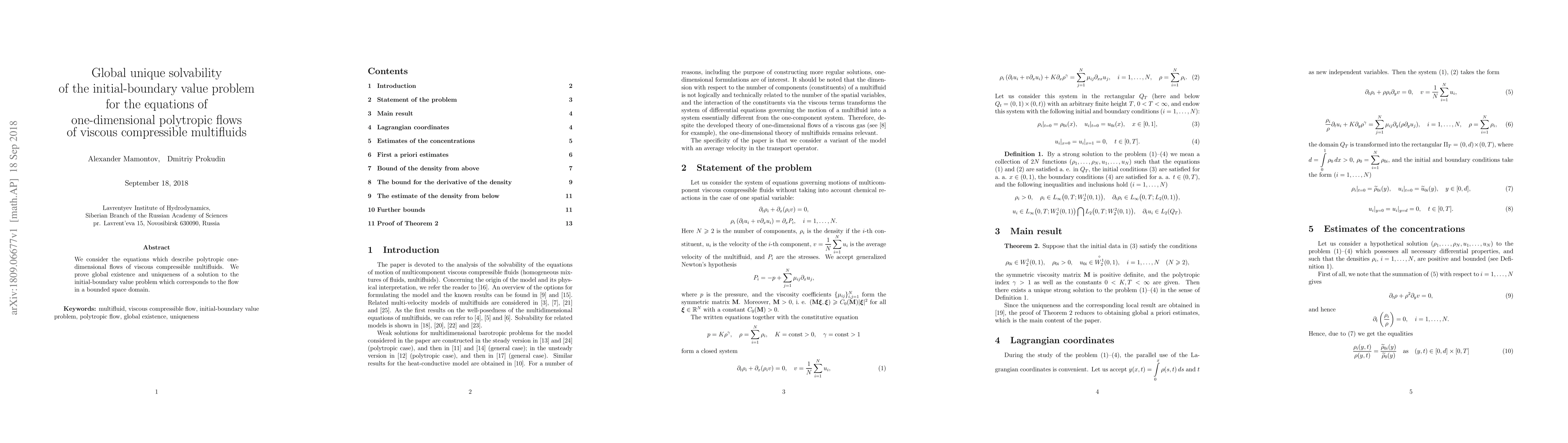 This paper proves global existence and uniqueness of solutions for the initial-boundary value problem of polytropic one-dimensional flows of viscous compressible multifluids in a bounded domain. The study addresses the mathematical framework governing these complex fluid dynamics.