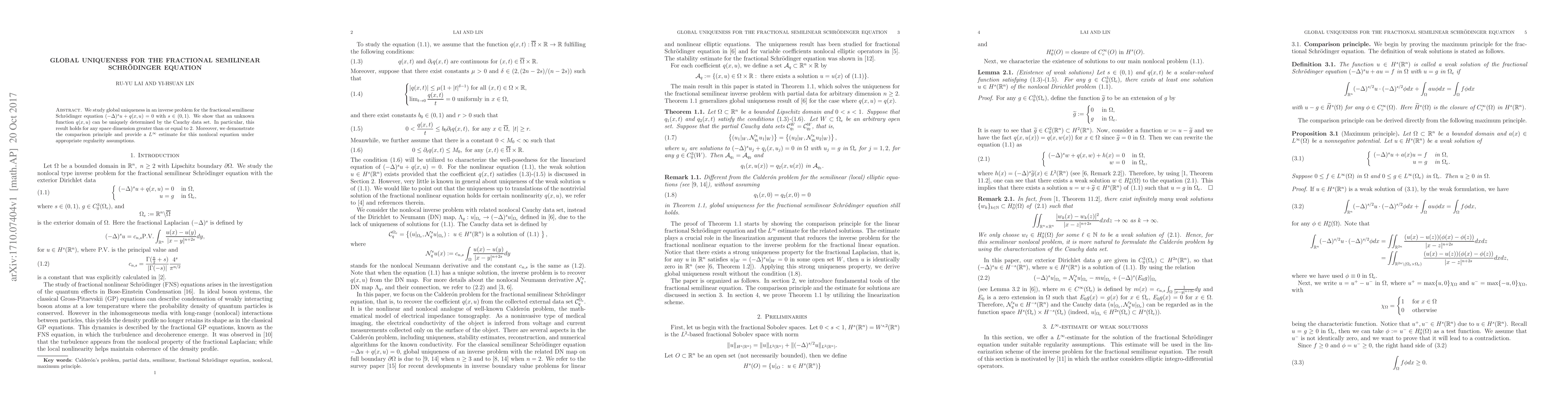 This paper investigates global uniqueness in an inverse problem for the fractional semilinear Schrödinger equation, proving that an unknown function can be uniquely determined from the Cauchy data set, regardless of the space dimension being at least $2$. It also establishes a comparison principle and provides an $L^\infty$ estimate for the equation under suitable regularity conditions.