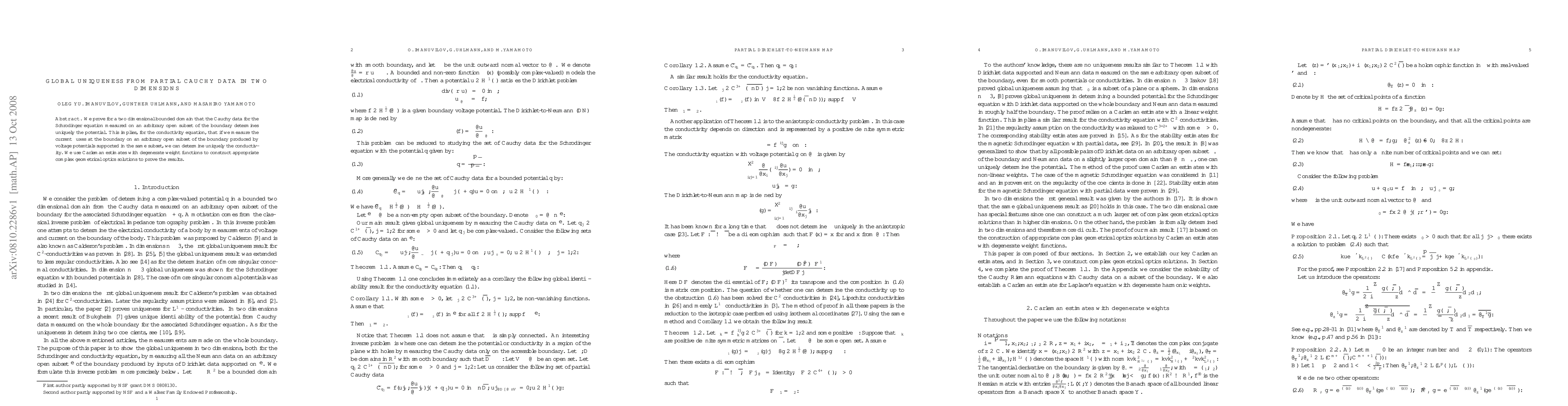 This paper proves global uniqueness for determining potentials in two dimensions from partial Cauchy data for the Schrödinger equation, extending the result to the conductivity equation. The authors use Carleman estimates with degenerate weight functions and complex geometrical optics solutions to achieve this.