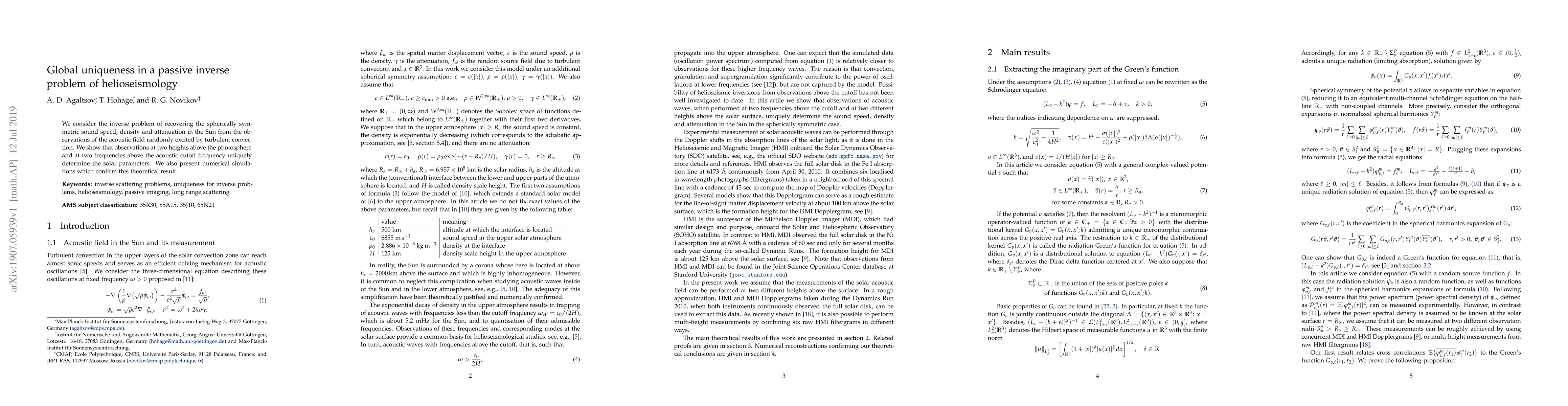 We consider the inverse problem of recovering the spherically symmetric sound speed, density and attenuation in the Sun from the observations of the acoustic field randomly excited by turbulent convection. We show that observations at two heights above the photosphere and at two frequencies above the acoustic cutoff frequency uniquely determine the solar parameters. We also present numerical simulations which confirm this theoretical result.