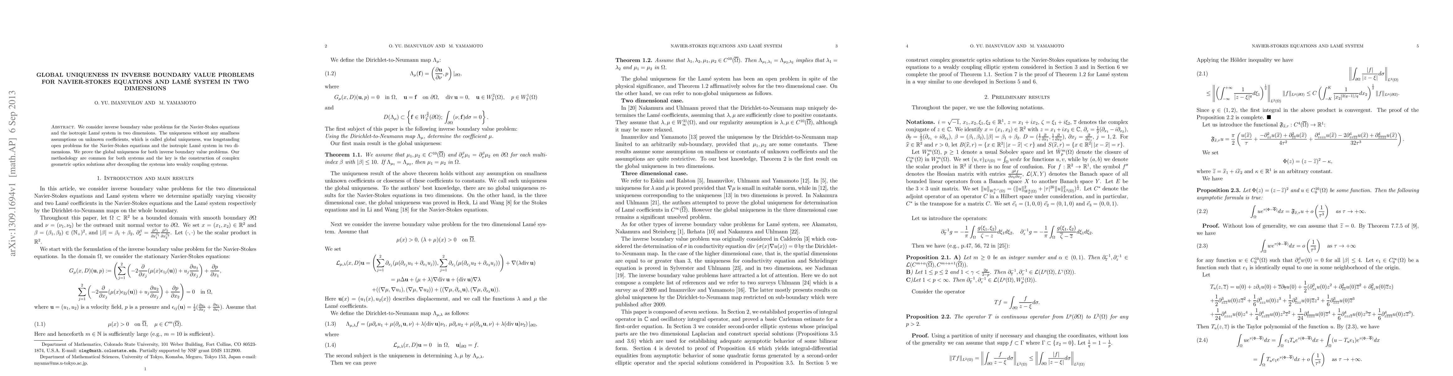 This paper proves global uniqueness for inverse boundary value problems concerning the Navier-Stokes and isotropic Lam\'e systems in two dimensions, without requiring any assumptions on the size of unknown coefficients. The methodology involves constructing complex geometric optics solutions after decoupling the systems.