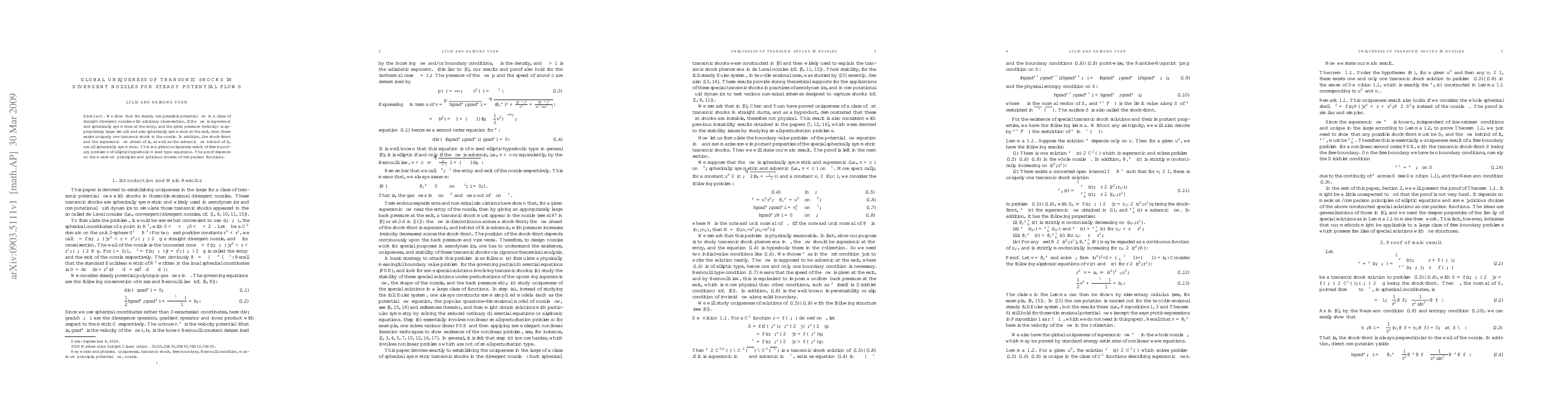 We show that for steady compressible potential flow in a class of straight divergent nozzles with arbitrary cross-section, if the flow is supersonic and spherically symmetric at the entry, and the given pressure (velocity) is appropriately large (small) and also spherically symmetric at the exit, then there exists uniquely one transonic shock in the nozzle. In addition, the shock-front and the supersonic flow ahead of it, as well as the subsonic flow behind of it, are all spherically symmetric. This is a global uniqueness result of free boundary problems of elliptic--hyperbolic mixed type equations. The proof depends on the maximum principles and judicious choices of comparison functions.