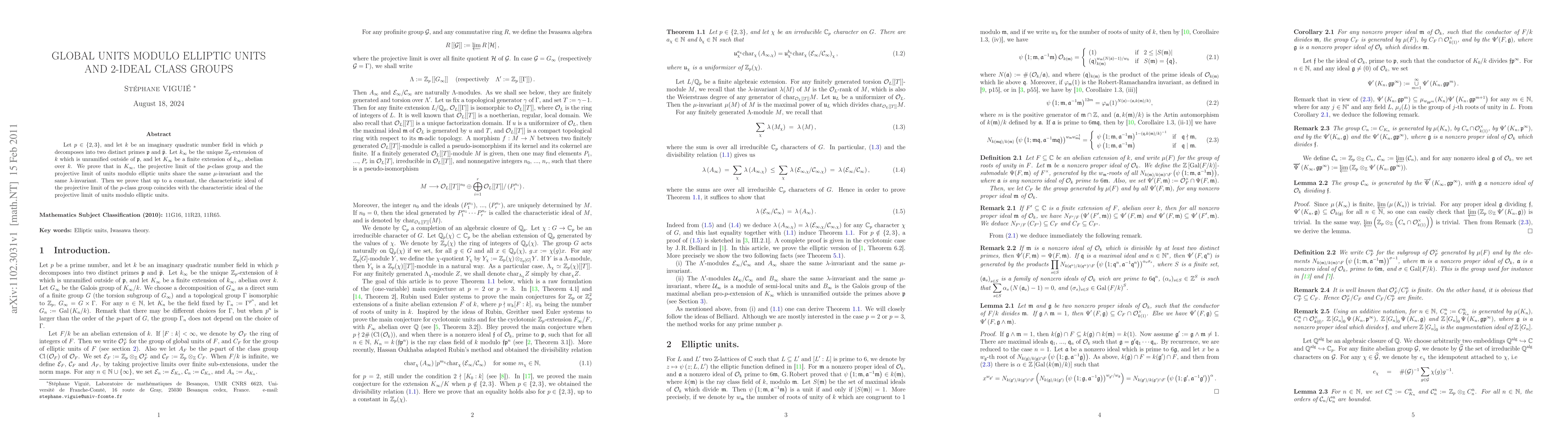 Let p\in\{2,3\}, and let k be an imaginary quadratic field in which p decomposes into two distinct primes \mathfrak{p} and \bar{\mathfrak{p}}. Let k_\infty be the unique Z_p-extension of k which is unramified outside of \mathfrak{p}, and let K_\infty be a finite extension of k_\infty, abelian over k. We prove that in K_\infty, the projective limit of the p-class group and the projective limit of units modulo elliptic units share the same \mu-invariant and the same \lambda-invariant. Then we prove that up to a constant, the characteristic ideal of the projective limit of the p-class group coincides with the characteristic ideal of the projective limit of units modulo elliptic units.