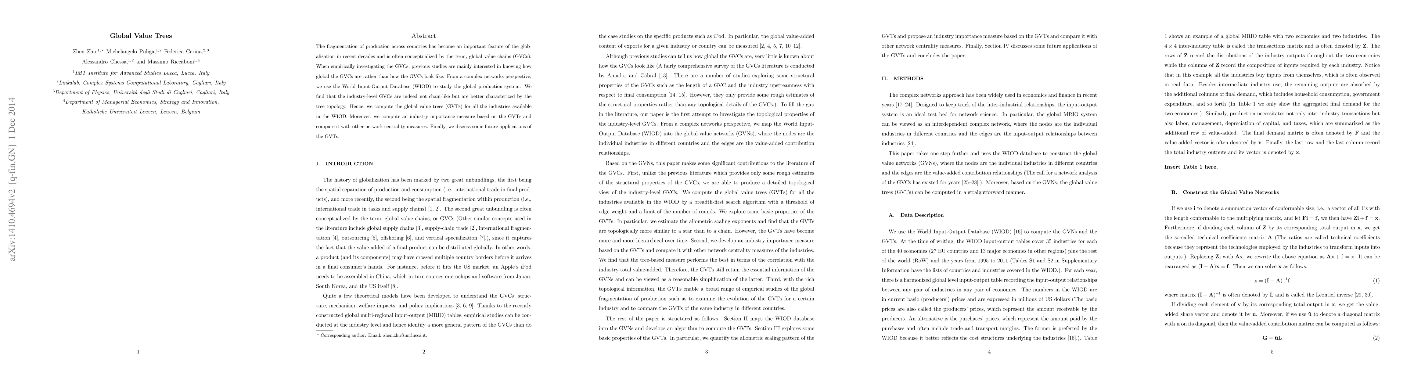 The fragmentation of production across countries has become an important feature of the globalization in recent decades and is often conceptualized by the term, global value chains (GVCs). When empirically investigating the GVCs, previous studies are mainly interested in knowing how global the GVCs are rather than how the GVCs look like. From a complex networks perspective, we use the World Input-Output Database (WIOD) to study the global production system. We find that the industry-level GVCs are indeed not chain-like but are better characterized by the tree topology. Hence, we compute the global value trees (GVTs) for all the industries available in the WIOD. Moreover, we compute an industry importance measure based on the GVTs and compare it with other network centrality measures. Finally, we discuss some future applications of the GVTs.