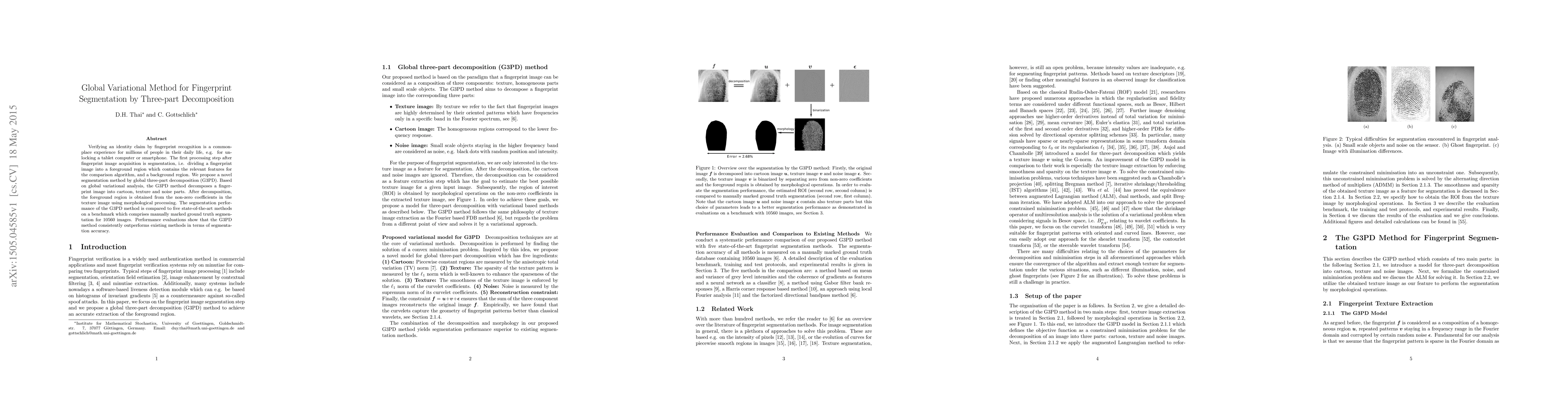 The paper proposes a novel segmentation method called Global Variational Method for Fingerprint Segmentation by Three-part Decomposition (G3PD) that decomposes fingerprint images into cartoon, texture, and noise parts. The method outperforms five state-of-the-art segmentation techniques in accuracy on a benchmark dataset of 10,560 images.
