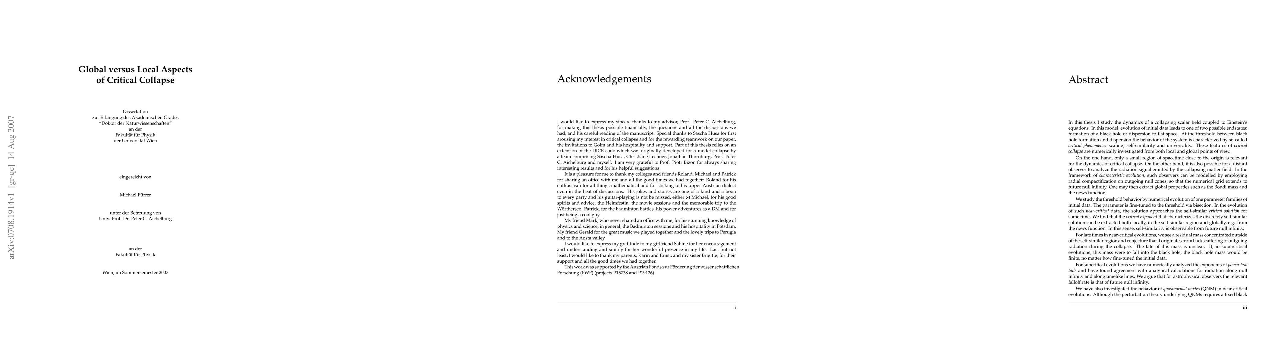 This thesis deals with critical collapse of a massless scalar field coupled to Einstein's equations in spherical symmetry. The system is numerically investigated from both global and local points of view using a characteristic slicing and radial compactification. We find that the critical exponent that characterizes the discretely self-similar solution can be extracted both locally, in the self-similar region and globally, e.g. from the news function. In this sense, self-similarity is observable from future null infinity. For subcritical evolutions we have numerically analyzed the exponents of power-law tails and have found agreement with analytical calculations for radiation along null infinity and along timelike lines. We argue that for astrophysical observers the relevant falloff rate is that of future null infinity. We have also investigated the behavior of quasinormal modes (QNM) in near-critical evolutions. Although the perturbation theory underlying QNMs requires a fixed black hole background, we have found a surprising correlation between the radiation signal with the period of the first QNM determined by the time-dependent Bondi mass. In this context, we have also been able to verify a stationarity criterion based on QNMs for the Vaidya metric, which models the time-dependent Schwarzschild background.