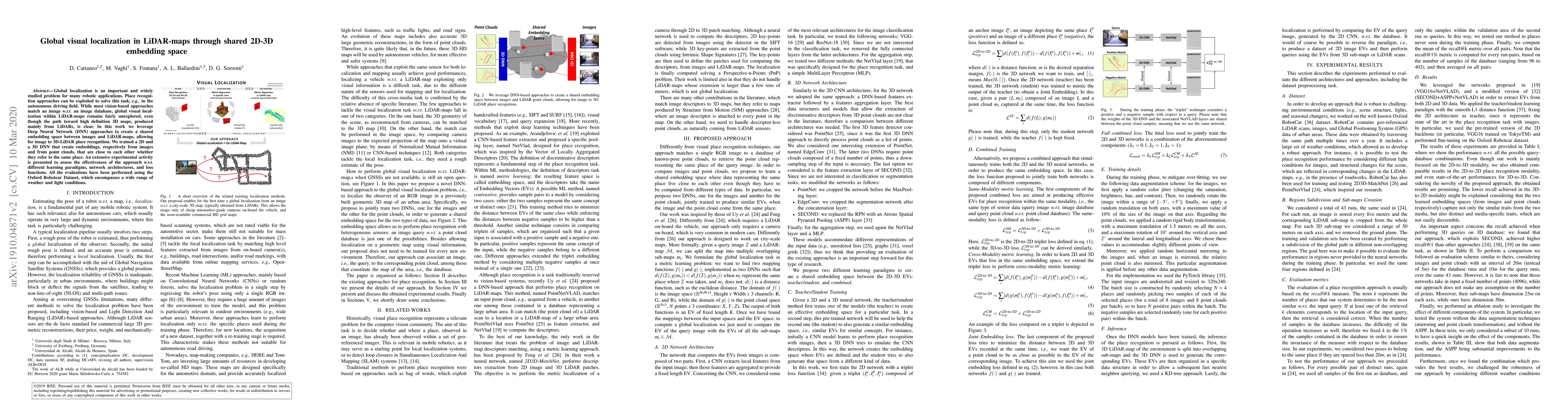 This paper proposes a Deep Neural Network (DNN) approach for global visual localization using a shared 2D-3D embedding space between images and LiDAR-maps, enabling image-to-3D place recognition. Experiments on the Oxford Robotcar Dataset demonstrate the effectiveness of the method under various learning paradigms and network architectures.