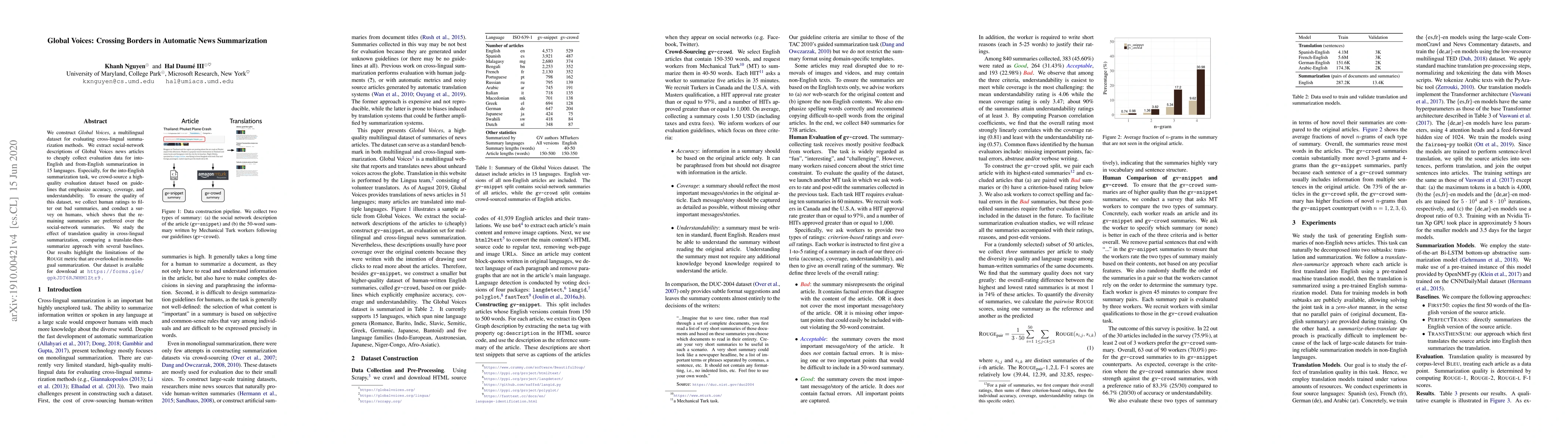 This paper introduces Global Voices, a multilingual dataset for cross-lingual summarization evaluation, focusing on into-English and from-English summarization in 15 languages. The authors crowdsource a high-quality evaluation dataset and highlight the limitations of the ROUGE metric in cross-lingual summarization.