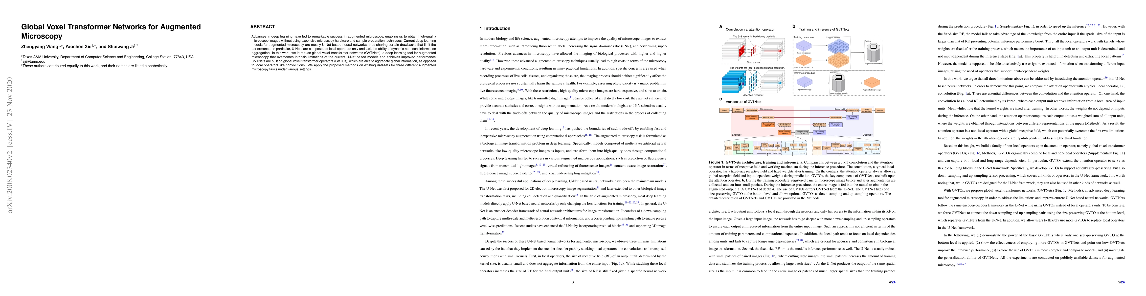 Researchers introduced Global Voxel Transformer Networks (GVTNets) for augmented microscopy, achieving improved performance over existing U-Net based models. GVTNets outperform previous approaches in three microscopy tasks under various settings.
