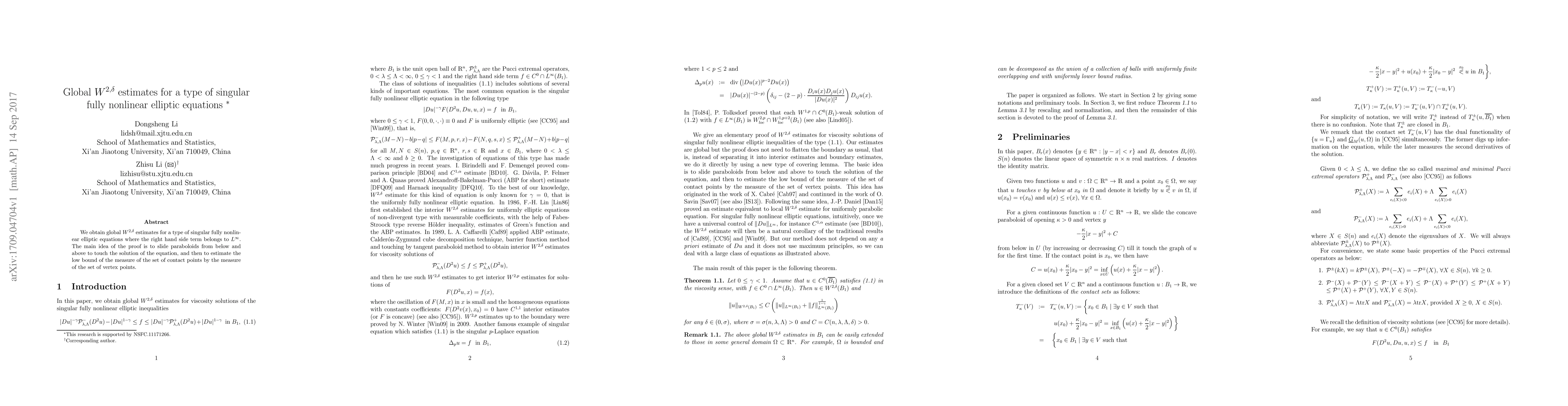 Summary: This paper establishes global $W^{2,\delta}$ estimates for a class of singular fully nonlinear elliptic equations with $L^\infty$ right-hand side terms. The proof leverages sliding paraboloids to touch the solution and estimates the measure of contact points based on the measure of vertex points.