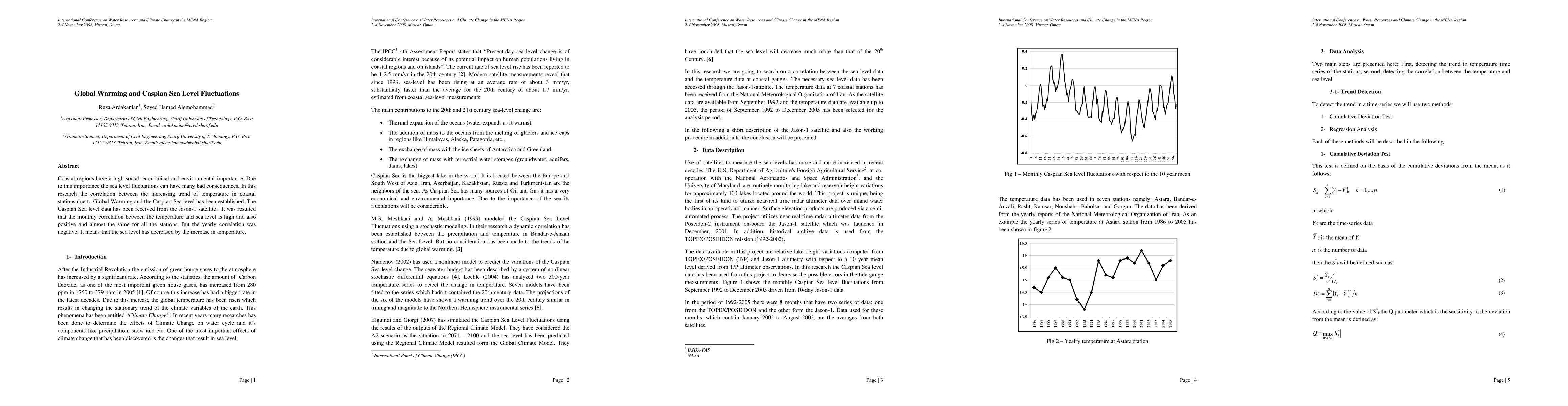Coastal regions have a high social, economical and environmental importance. Due to this importance the sea level fluctuations can have many bad consequences. In this research the correlation between the increasing trend of temperature in coastal stations due to Global Warming and the Caspian Sea level has been established. The Caspian Sea level data has been received from the Jason-1 satellite. It was resulted that the monthly correlation between the temperature and sea level is high and also positive and almost the same for all the stations. But the yearly correlation was negative. It means that the sea level has decreased by the increase in temperature.