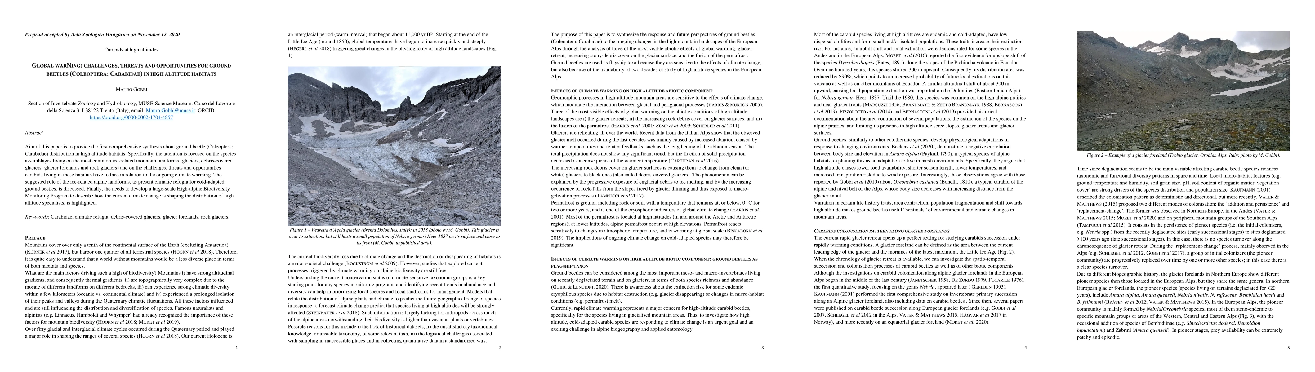 This paper synthesizes the distribution of ground beetles in high altitude ice-related habitats, highlighting the challenges they face due to climate warming, and suggests these habitats may serve as refugia. It calls for a large-scale monitoring program to track the impact of climate change on high altitude specialists.