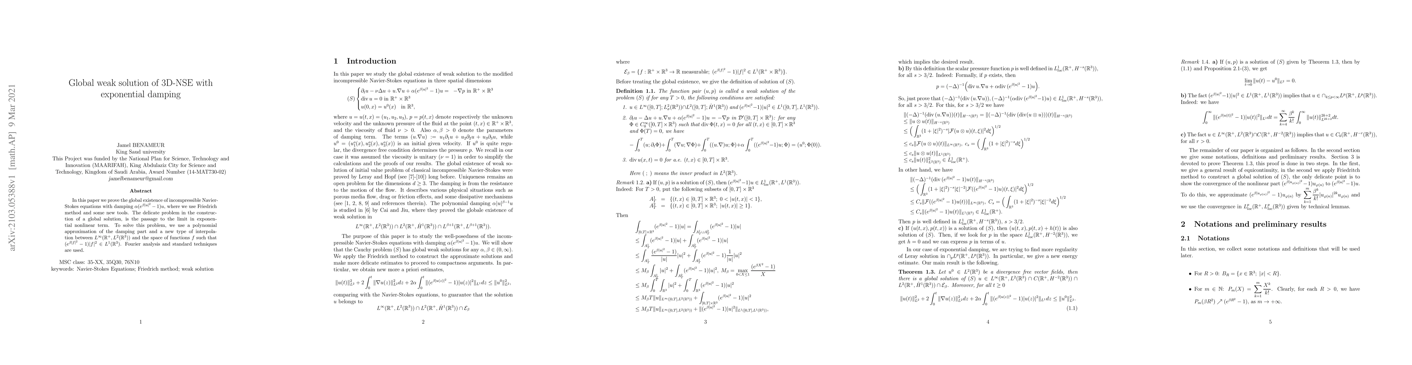In this paper we prove the global existence of incompressible Navier-Stokes equations with damping $\alpha (e^{\beta |u|^2}-1)u$, where we use Friedrich method and some new tools. The delicate problem in the construction of a global solution, is the passage to the limit in exponential nonlinear term. To solve this problem, we use a polynomial approximation of the damping part and a new type of interpolation between $L^\infty(\mathbb{R}^+,L^2(\mathbb{R}^3))$ and the space of functions $f$ such that $(e^{\beta|f|^2}-1)|f|^2\in L^1(\mathbb{R}^3)$. Fourier analysis and standard techniques are used.