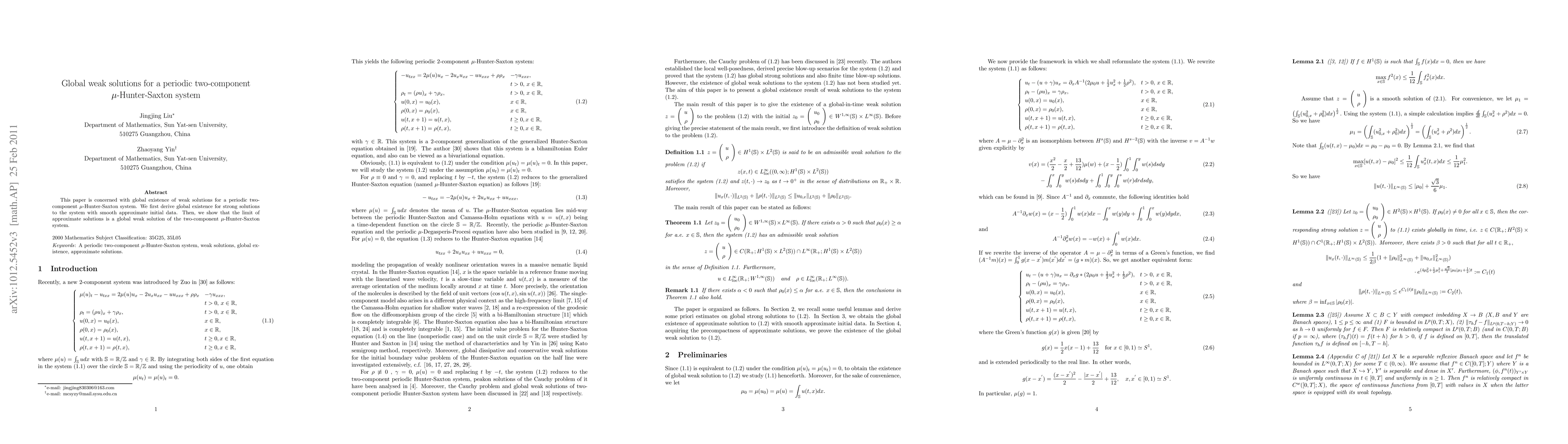This paper establishes the global existence of weak solutions for a periodic two-component $\mu$-Hunter-Saxton system by first proving the existence of strong solutions with smooth initial data, then demonstrating that these solutions converge to a global weak solution.