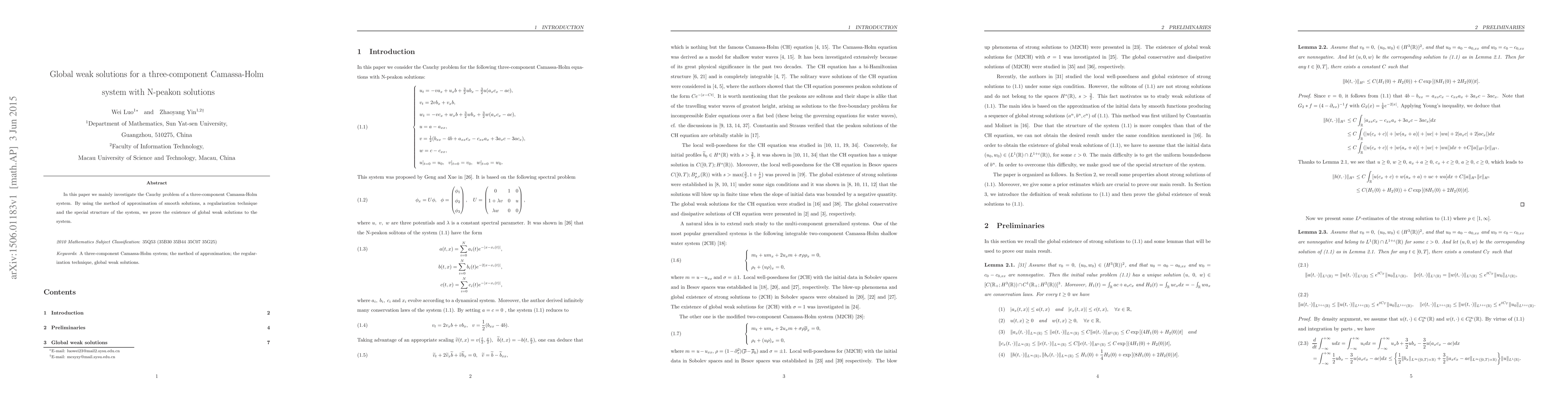 This paper investigates the existence of global weak solutions for a three-component Camassa-Holm system, employing approximation methods, regularization techniques, and leveraging the system's unique structure. The study confirms the presence of N-peakon solutions.
