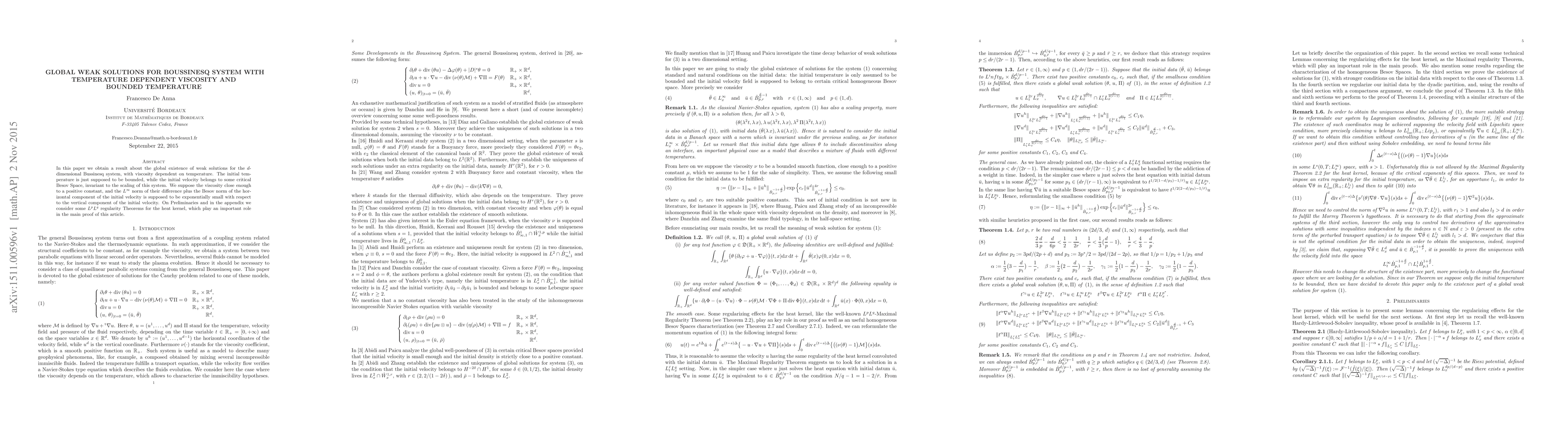 In this paper we obtain a result about the global existence of weak solutions for the $d$-dimensional Bussinesq system, with viscosity dependent on temperature. The initial temperature is just supposed to be bounded, while the initial velocity belongs to some critical Besov Space, invariant to the scaling of this system. We suppose the viscosity close enough to a positive constant, and the $L^\infty$ norm of their difference plus the Besov norm of the horizontal component of the initial velocity is supposed to be exponentially small with respect to the vertical component of the initial velocity. On Preliminaries and in the appendix we consider some $L^p L^q$ regularity Theorems for the heat kernel, which play an important role in the main proof of this article.