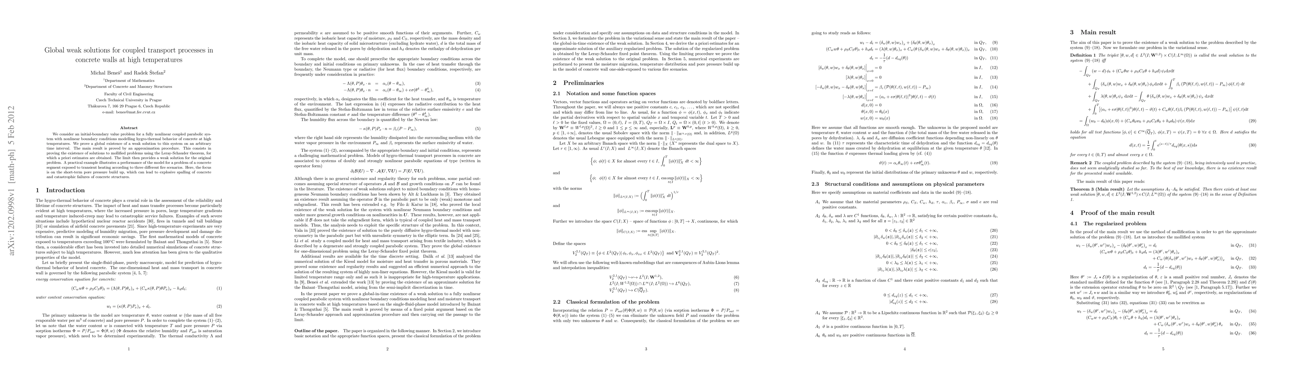 This paper proves global weak solutions for a nonlinear coupled parabolic system modeling the hygro-thermal behavior of concrete at high temperatures. The existence of solutions is demonstrated through an approximation procedure using mollified problems and apriori estimates, leading to a practical example illustrating the model's effectiveness in predicting short-term pore pressure build-up and potential spalling in concrete structures.