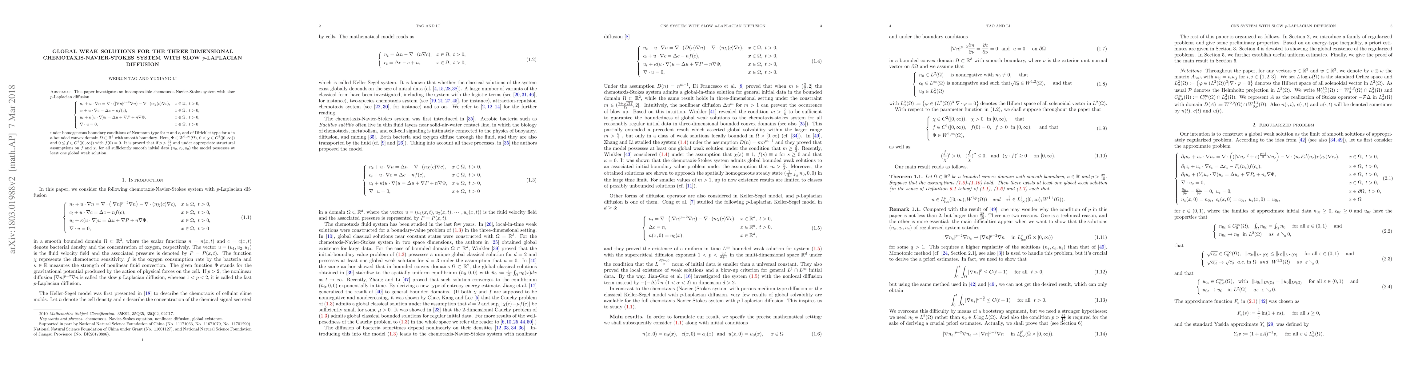This paper investigates the existence of global weak solutions for a three-dimensional chemotaxis-Navier-Stokes system with slow $p$-Laplacian diffusion, proving the existence under certain conditions on the functions $f$ and $\chi$, and for $p>\frac{32}{15}$. The system is analyzed under homogeneous Neumann and Dirichlet boundary conditions.