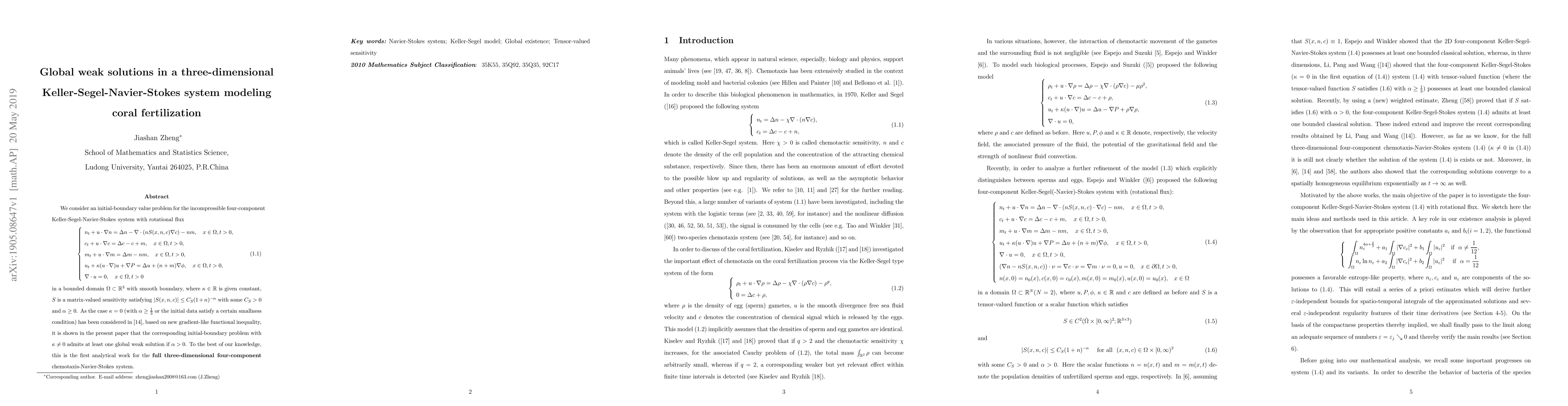 This paper presents the existence of global weak solutions for the three-dimensional Keller-Segel-Navier-Stokes system modeling coral fertilization, under the condition that the sensitivity parameter $\alpha > 0$. This is the first analytical study for the full three-dimensional four-component chemotaxis-Navier-Stokes system.