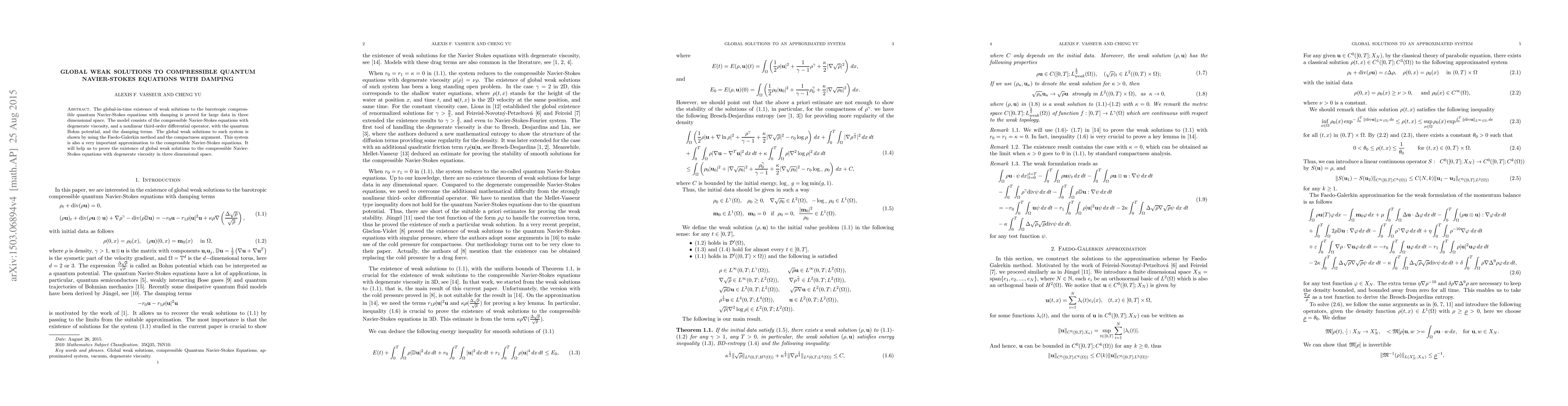 This paper proves the global-in-time existence of weak solutions for the compressible quantum Navier-Stokes equations with damping for large initial data in three dimensions. The authors utilize the Faedo-Galerkin method and compactness arguments to establish the results, which also serve as an approximation to the classical compressible Navier-Stokes equations.
