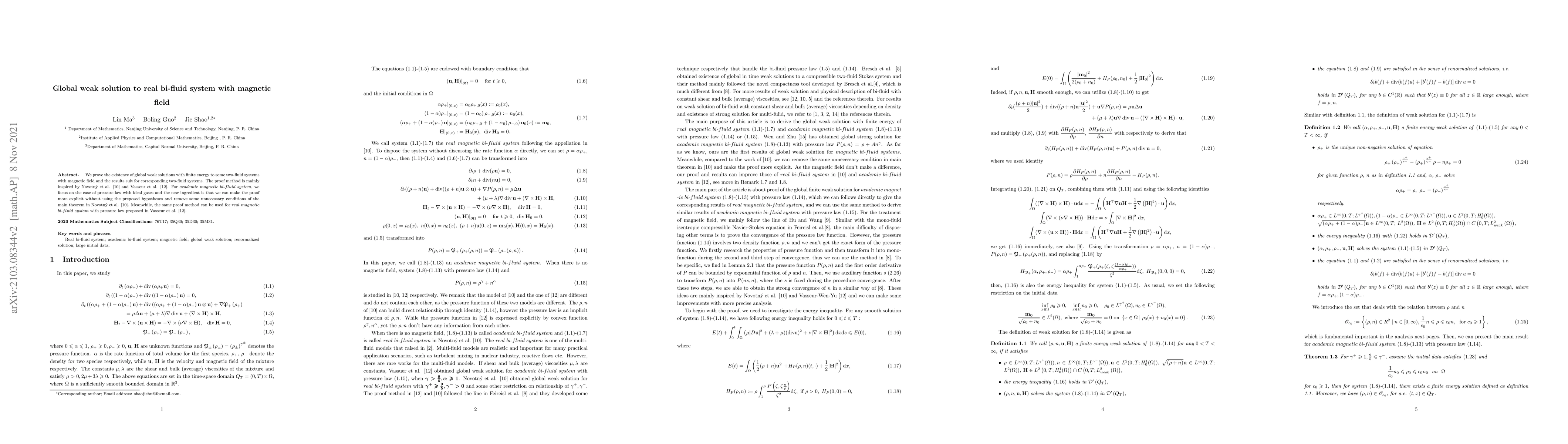 We prove the existence of global weak solutions with finite energy to some two-fluid systems with magnetic field and the results suit for corresponding two-fluid systems. The proof method is mainly inspired by Novotn\'y et al. and Vasseur et al. For $academic~magnetic~ bi\text{-}fluid~ system$, we focus on the case of pressure law with ideal gases and the new ingredient is that we can make the proof more explicit without using the preposed hypotheses and remove some unnecessary conditions of the main theorem in Novotn\'y et al. Meanwhile, the same proof method can be used for $real~magnetic~bi\text{-}fluid~system$ combined with pressure law proposed in Vasseur et al.