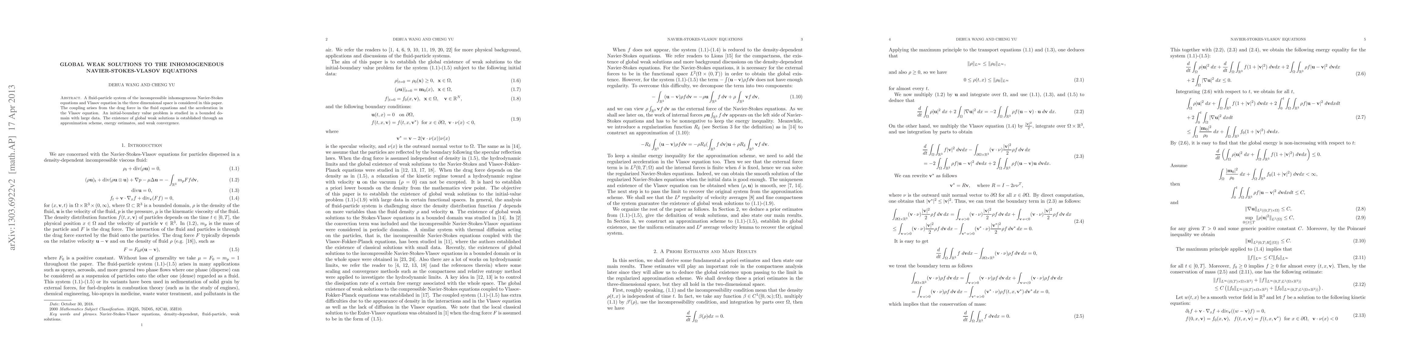 This paper establishes the existence of global weak solutions for a coupled fluid-particle system described by the inhomogeneous Navier-Stokes and Vlasov equations, using an approximation scheme, energy estimates, and weak convergence techniques. The study focuses on a bounded domain with large initial data.