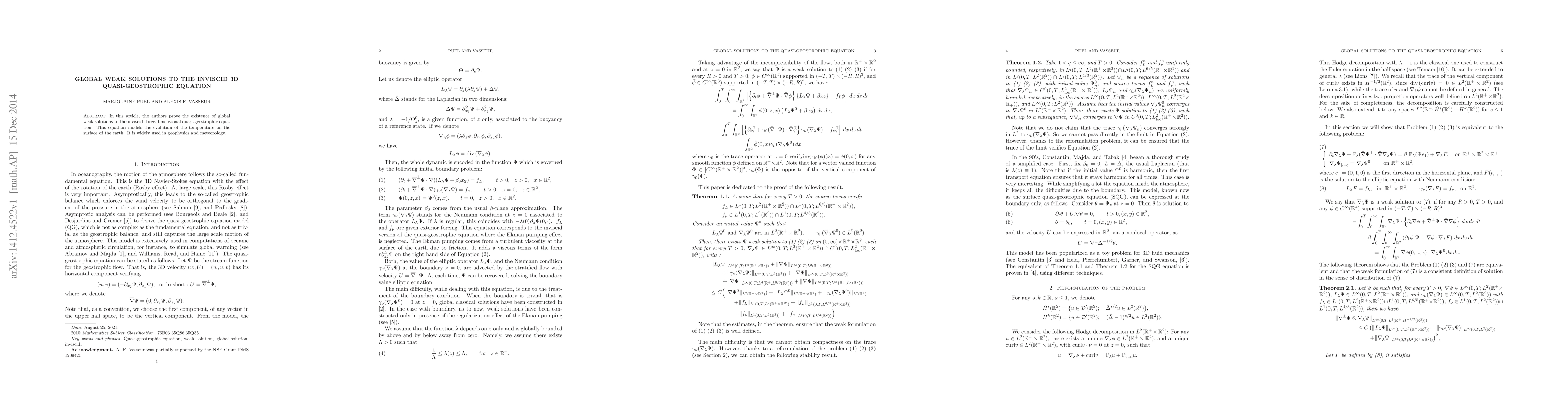 Summary: The paper proves the existence of global weak solutions to the inviscid 3D Quasi-Geostrophic equation, which is a key model for temperature evolution on Earth's surface, with applications in geophysics and meteorology. This result advances the understanding of long-term behavior in these fields.