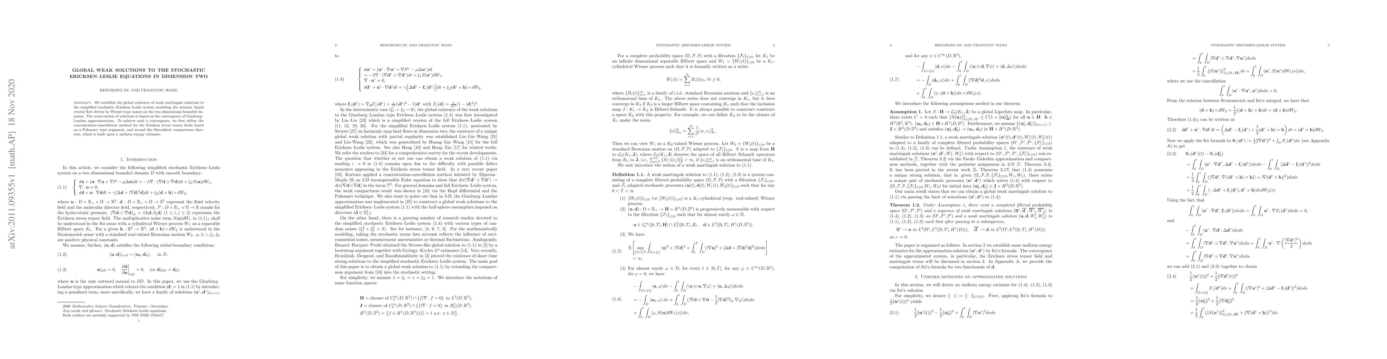 This paper establishes the global existence of weak martingale solutions for the stochastic Ericksen--Leslie equations modeling nematic liquid crystal flow in two dimensions, driven by Wiener-type noise. The solution construction leverages the convergence of Ginzburg-Landau approximations, employing the concentration-cancellation method and the Skorokhod compactness theorem.