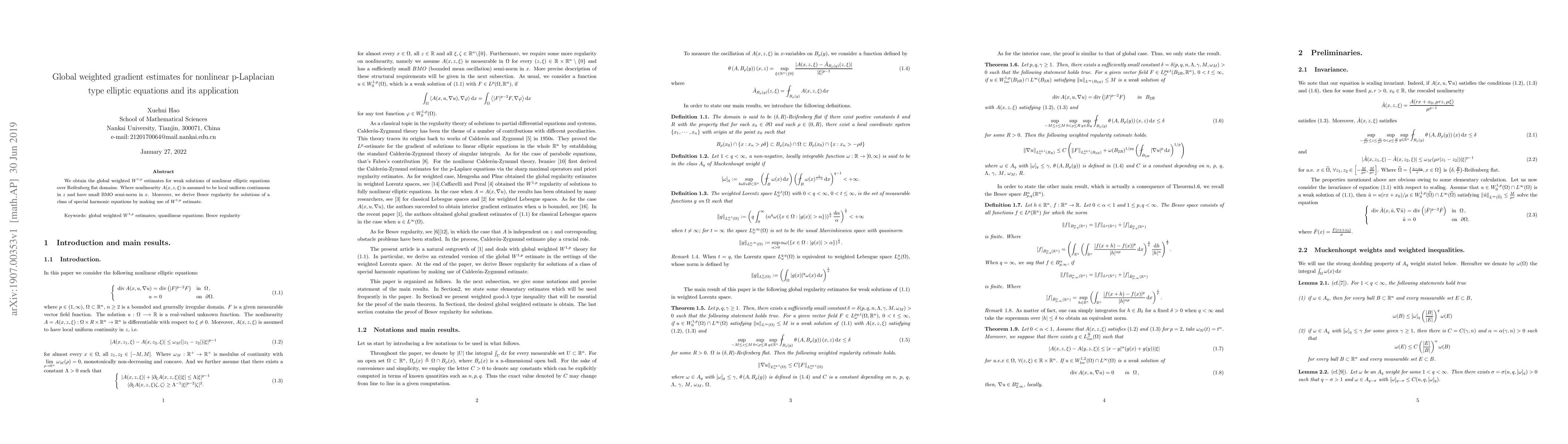 We obtain the global weighted $W^{1,p}$ estimates for weak solutions of nonlinear elliptic equations over Reifenberg flat domains. Where nonlinearity $A(x,z,\xi)$ is assumed to be local uniform continuous in $z$ and have small BMO semi-norm in $x$. Moreover, we derive Besov regularity for solutions of a class of special harmonic equations by making use of $W^{1,p}$ estimate. Keywords: global weighted $W^{1,p}$ estimates; quasilinear equations; Besov regularity