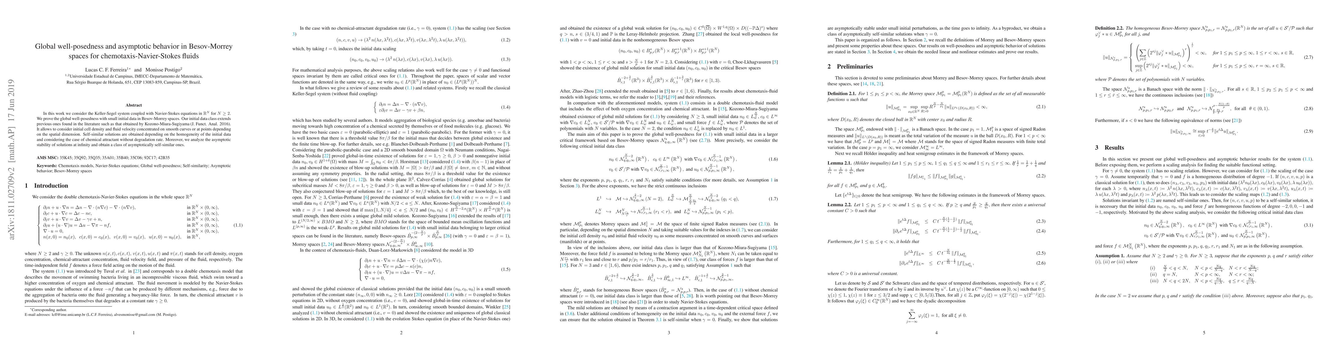 This paper proves global well-posedness for the Keller-Segel system coupled with Navier-Stokes equations in higher dimensions, using Besov-Morrey spaces for initial data. It extends previous results to include more concentrated initial conditions and analyzes the asymptotic stability and self-similar solutions of the system.